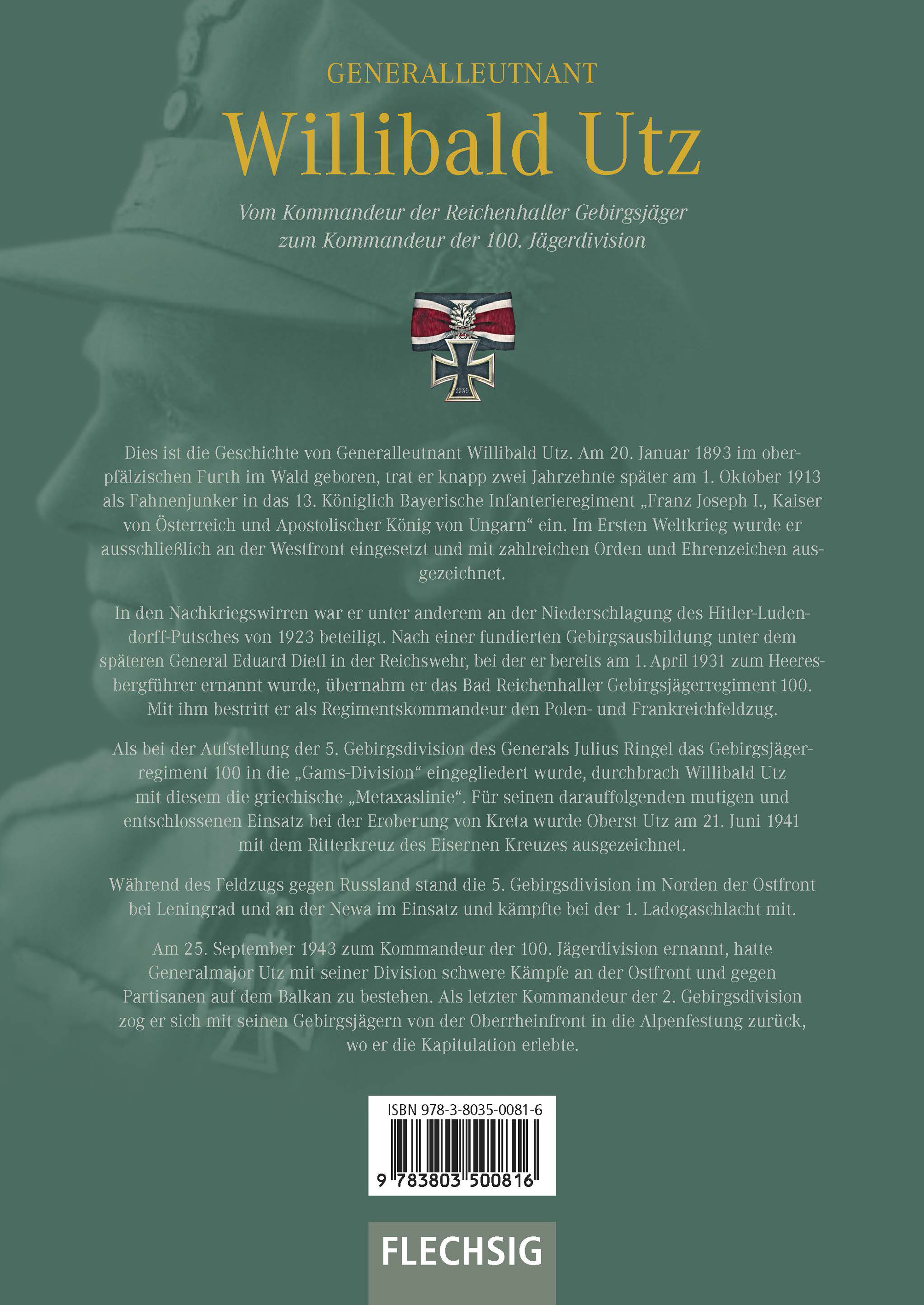 Dies ist die Geschichte von Generalleutnant Willibald Utz. Am 20. Januar 1893 im oberpfälzischen Furth im Wald geboren, trat er knapp zwei Jahrzehnte später am 1. Oktober 1913 als Fahnenjunker in das 13. Königlich Bayerische Infanterieregiment "Franz Joseph I., Kaiser von Österreich und Apostolischer König von Ungarn" ein. Im Ersten Weltkrieg wurde er ausschließlich an der Westfront eingesetzt und mit zahlreichen Orden und Ehrenzeichen ausgezeichnet.In den Nachkriegswirren war er unter anderem an der Niederschlagung des Hitler-Ludendorff-Putsches von 1923 beteiligt. Nach einer fundierten Gebirgsausbildung unter dem späteren General Eduard Dietl in der Reichswehr, bei der er bereits am 1. April 1931 zum Heeresbergführer ernannt wurde, übernahm er das Bad Reichenhaller Gebirgsjägerregiment 100. Mit ihm bestritt er als Regimentskommandeur den Polen- und Frankreichfeldzug.Als bei der Aufstellung der 5. Gebirgsdivision des Generals Julius Ringel das Gebirgsjägerregiment 100 in die "Gams-Division" eingegliedert wurde, durchbrach Willibald Utz mit diesem die griechische "Metaxaslinie". Für seinen darauffolgenden mutigen und entschlossenen Einsatz bei der Eroberung von Kreta wurde Oberst Utz am 21. Juni 1941 mit dem Ritterkreuz des Eisernen Kreuzes ausgezeichnet.Während des Feldzugs gegen Russland stand die 5. Gebirgsdivision im Norden der Ostfront bei Leningrad und an der Newa im Einsatz und kämpfte bei der 1. Ladogaschlacht mit.Am 25. September 1943 zum Kommandeur der 100. Jägerdivision ernannt, hatte Generalmajor Utz mit seiner Division schwere Kämpfe an der Ostfront und gegen Partisanen auf dem Balkan zu bestehen. Als letzter Kommandeur der 2. Gebirgsdivision zog er sich mit seinen Gebirgsjägern von der Oberrheinfront in die Alpenfestung zurück, wo er die Kapitulation erlebte.