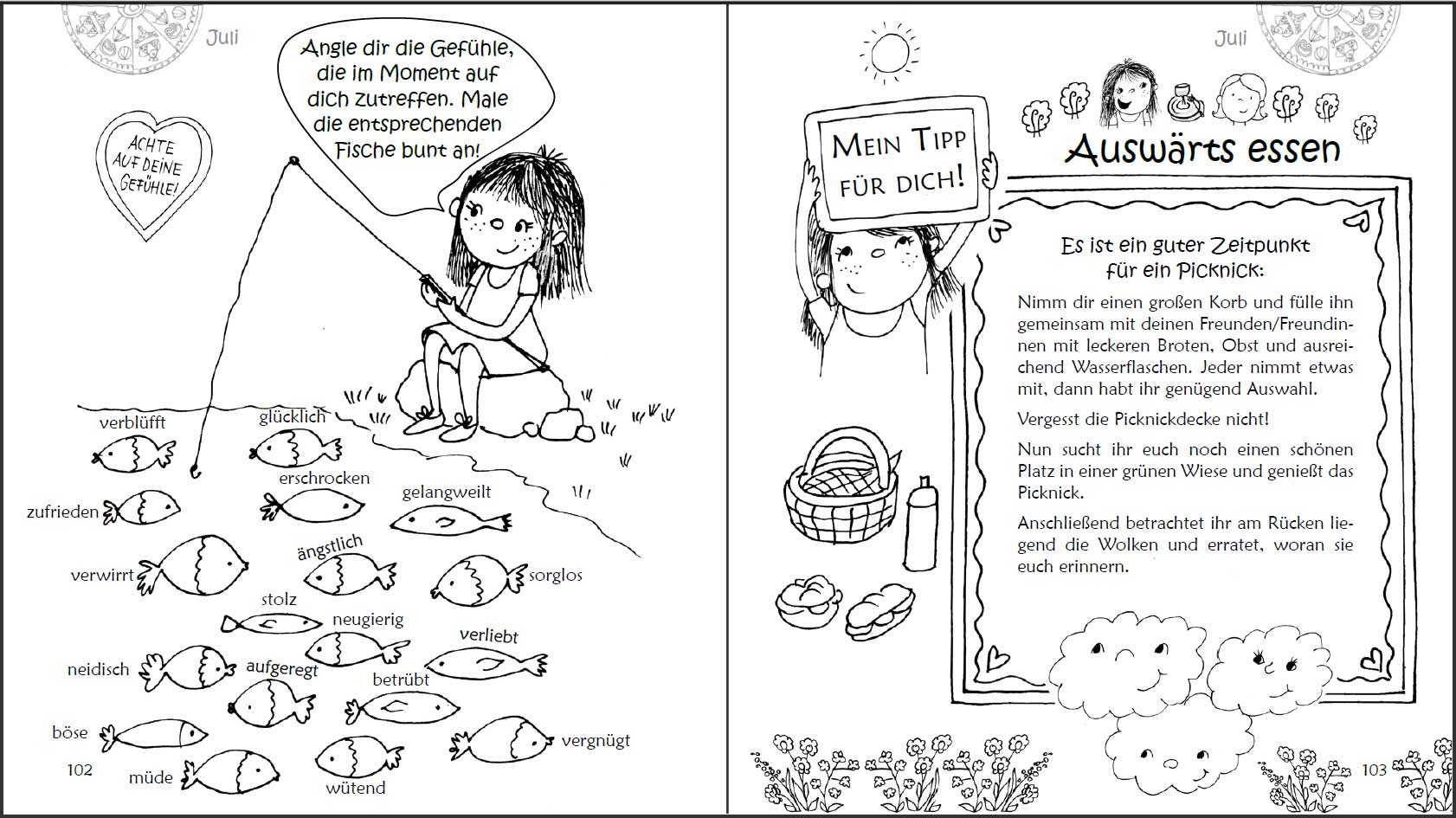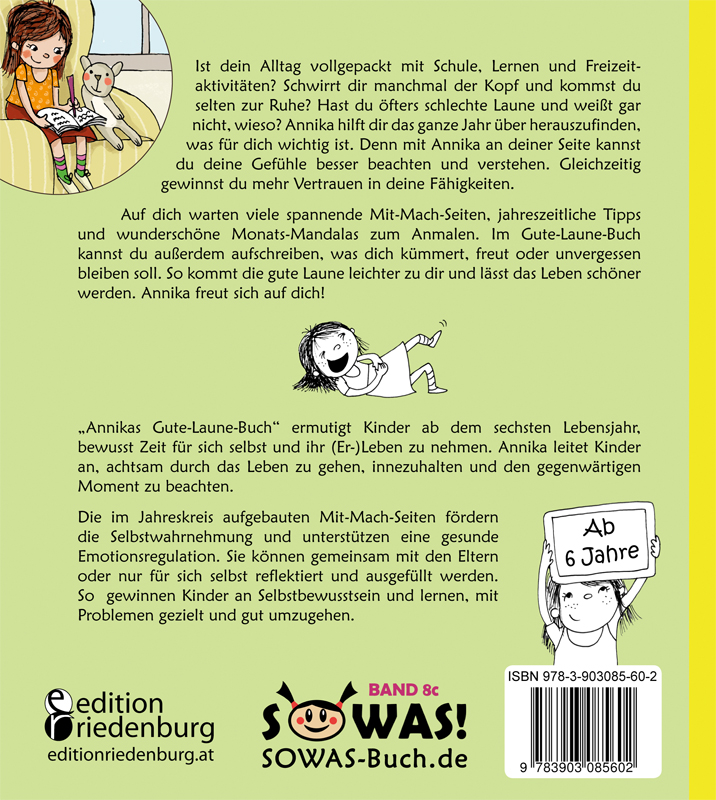 Ich bin Annika. In meinem Leben ist eine Menge los! Es gibt Tage, die sind richtige Glückstage. Ich fühle mich voller Energie und könnte aus Freude die ganze Welt umarmen. Und dann gibt es Tage, an denen bin ich schlecht gelaunt. Ich fühle mich, als hätte jemand die Luft aus einem Schlauchboot gelassen: müde, kraftlos und ausgelaugt. Meine Gedanken und Gefühle wirbeln durcheinander und ich weiß zuerst nicht, wie ich mich beruhigen und wieder klar denken kann. Geht es dir ähnlich? Zum Glück habe ich herausgefunden, was mir an solchen Tagen hilft: Ich nehme mir Zeit, höre in mich hinein und beachte meine Gefühle. Wie ein Gefühls-Detektiv bin ich auf der Suche nach dem, was ich tief in mir spüre. Das macht mein Leben einfacher. Mein Gute-Laune-Buch hilft dir, deine Gefühle besser zu verstehen und herauszufinden, wer du bist und was für dich wichtig ist. Ich begleite dich durch Herbst, Winter, Frühling und Sommer. Fang gleich an, nach dem passenden Monat zu suchen, denn du kannst jederzeit einsteigen und den passenden Tipp je nach Jahreszeit für dich heraussuchen. Es gibt so viel zu entdecken und auszufüllen. Und wenn du magst, sing doch dabei mein Lied! Worauf wartest du noch? Schnapp dir deine Stifte und leg los! Deine Annika