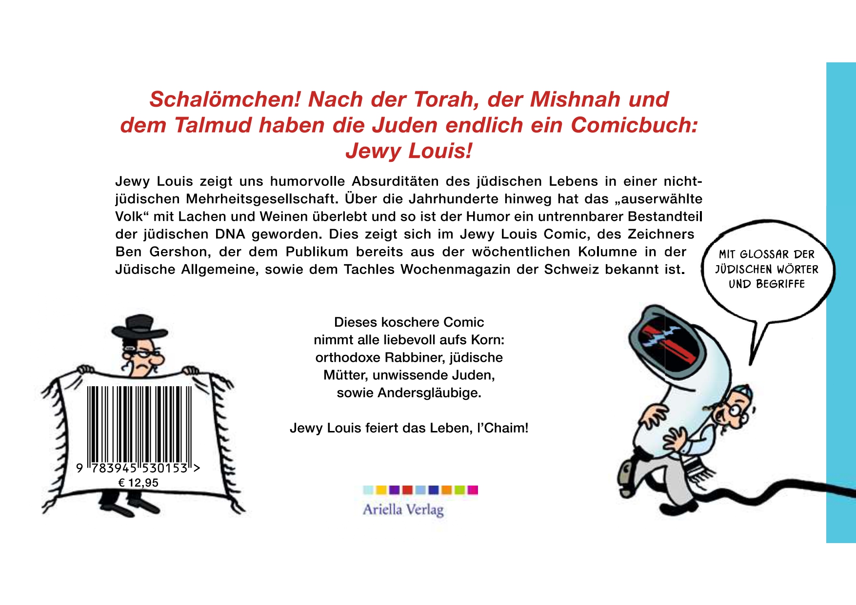 Schalömchen! Nach der Torah, der Mishnah und dem Talmud haben die Juden endlich ein Comicbuch: Jewy Louis! Witzige Koschere Comics von Ben Gershon , Schalömchen! Jewy Louis zeigt uns humorvolle Absurditäten des jüdischen Lebens in einer nichtjüdischen Mehrheitsgesellschaft. Über die Jahrhunderte hinweg hat das "auserwählte Volk" mit Lachen und Weinen überlebt und so ist der Humor ein untrennbarerBestandteil der jüdischen DNA geworden. Dies zeigt sich im Jewy Louis Comic, des Zeichners Ben Gershon, der dem Publikum bereits aus der wöchentlichen Kolumne in der Jüdische Allgemeine, sowie dem Tachles Wochenmagazin der Schweiz bekannt ist.Dieses koschere Comic nimmt alle liebevoll aufs Korn: orthodoxe Rabbiner, jüdische Mütter, unwissende Juden, sowie Andersgläubige. Jewy Louis feiert das Leben, l'Chaim!