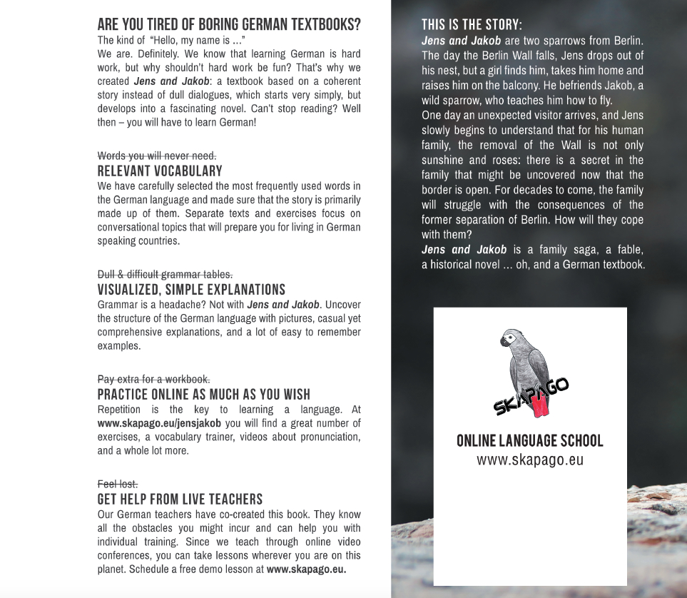 Hast du genug von langweiligen Deutschbüchern? Wir schon. Deutsch lernen ist harte Arbeit, aber warum darf harte Arbeit keinen Spaß machen? Darum haben wir ein Deutschbuch geschrieben, das aus einer zusammenhängenden Geschichte besteht statt aus langweiligen Dialogen. Die Geschichte fängt ganz einfach an und entwickelt sich zu einem faszinierenden Roman. Du kannst nicht aufhören zu lesen? Tja - dann musst du wohl Deutsch lernen!