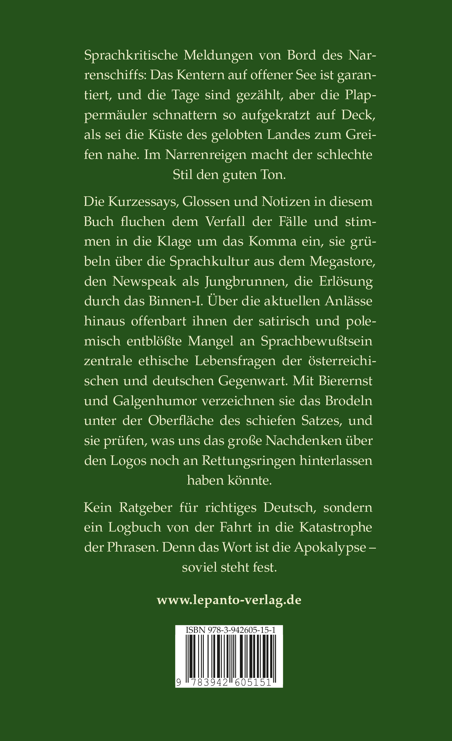 Sprachkritische Meldungen von Bord des Narrenschiffs: Das Kentern auf offener See ist garantiert, und die Tage sind gezählt, aber die Plappermäuler schnattern so aufgekratzt auf Deck, als sei die Küste des gelobten Landes zum Greifen nahe. Im Narrenreigen macht der schlechte Stil den guten Ton.Die Kurzessays, Glossen und Notizen in diesem Buch fluchen dem Verfall der Fälle und stimmen in die Klage um das Komma ein, sie grübeln über die Sprachkultur aus dem Megastore, den Newspeak als Jungbrunnen, die Erlösung durch das Binnen-I. Über die aktuellen Anlässe hinaus offenbart ihnen der satirisch und polemisch entblößte Mangel an Sprachbewußtsein zentrale ethische Lebensfragen der österreichischen und deutschen Gegenwart. Mit Bierernst und Galgenhumor verzeichnen sie das Brodeln unter der Oberfläche des schiefen Satzes, und sie prüfen, was uns das große Nachdenken über den Logos noch an Rettungsringen hinterlassen haben könnte.Kein Ratgeber für richtiges Deutsch, sondern ein Logbuch von der Fahrt in die Katastrophe der Phrasen. Denn das Wort ist die Apokalypse - soviel steht fest.