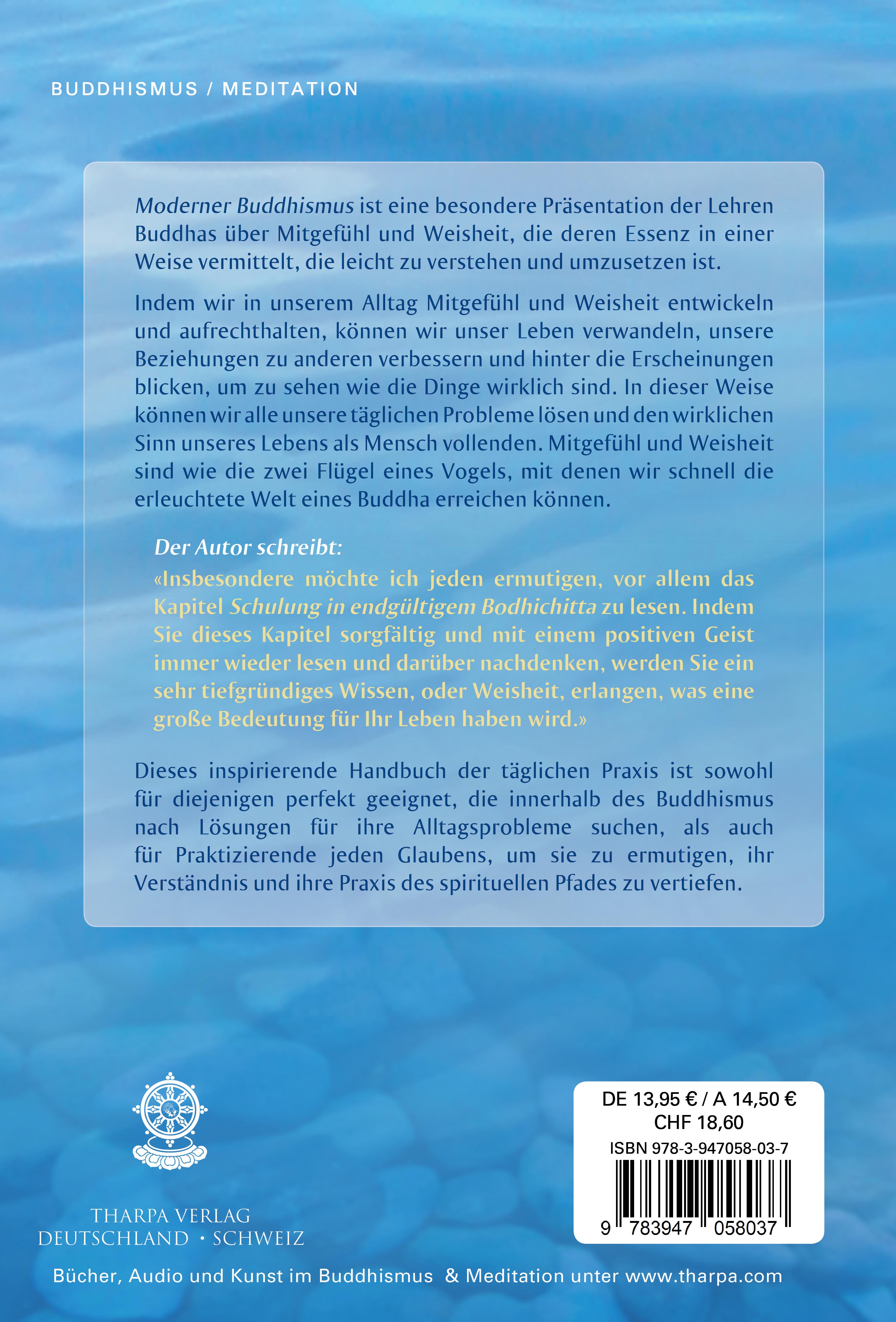 Moderner Buddhismus ist eine besondere Präsentation der Lehren Buddhas über Mitgefühl und Weisheit, die deren Essenz in einer Weise vermittelt, die leicht zu verstehen und umzusetzen ist. Indem wir in unserem Alltag Mitgefühl und Weisheit entwickeln und aufrechthalten, können wir unser Leben verwandeln, unsere Beziehungen zu anderen verbessern und hinter die Erscheinungen blicken, um zu sehen wie die Dinge wirklich sind. In dieser Weise können wir alle unsere täglichen Probleme lösen und den wirklichen Sinn unseres Lebens als Mensch vollenden. Mitgefühl und Weisheit sind wie die zwei Flügel eines Vogels, mit denen wir schnell die erleuchtete Welt eines Buddha erreichen können.Der Autor schreibt:«Insbesondere möchte ich jeden ermutigen, vor allem das Kapitel Schulung in endgültigem Bodhichitta zu lesen. Indem Sie dieses Kapitel sorgfältig und mit einem positiven Geist immer wieder lesen und darüber nachdenken, werden Sie ein sehr tiefgründiges Wissen, oder Weisheit, erlangen, was eine große Bedeutung für Ihr Leben haben wird.»Dieses inspirierende Handbuch der täglichen Praxis ist sowohl für diejenigen perfekt geeignet, die innerhalb des Buddhismus nach Lösungen für ihre Alltagsprobleme suchen, als auch für Praktizierende jeden Glaubens, um sie zu ermutigen, ihr Verständnis und ihre Praxis des spirituellen Pfades zu vertiefen.