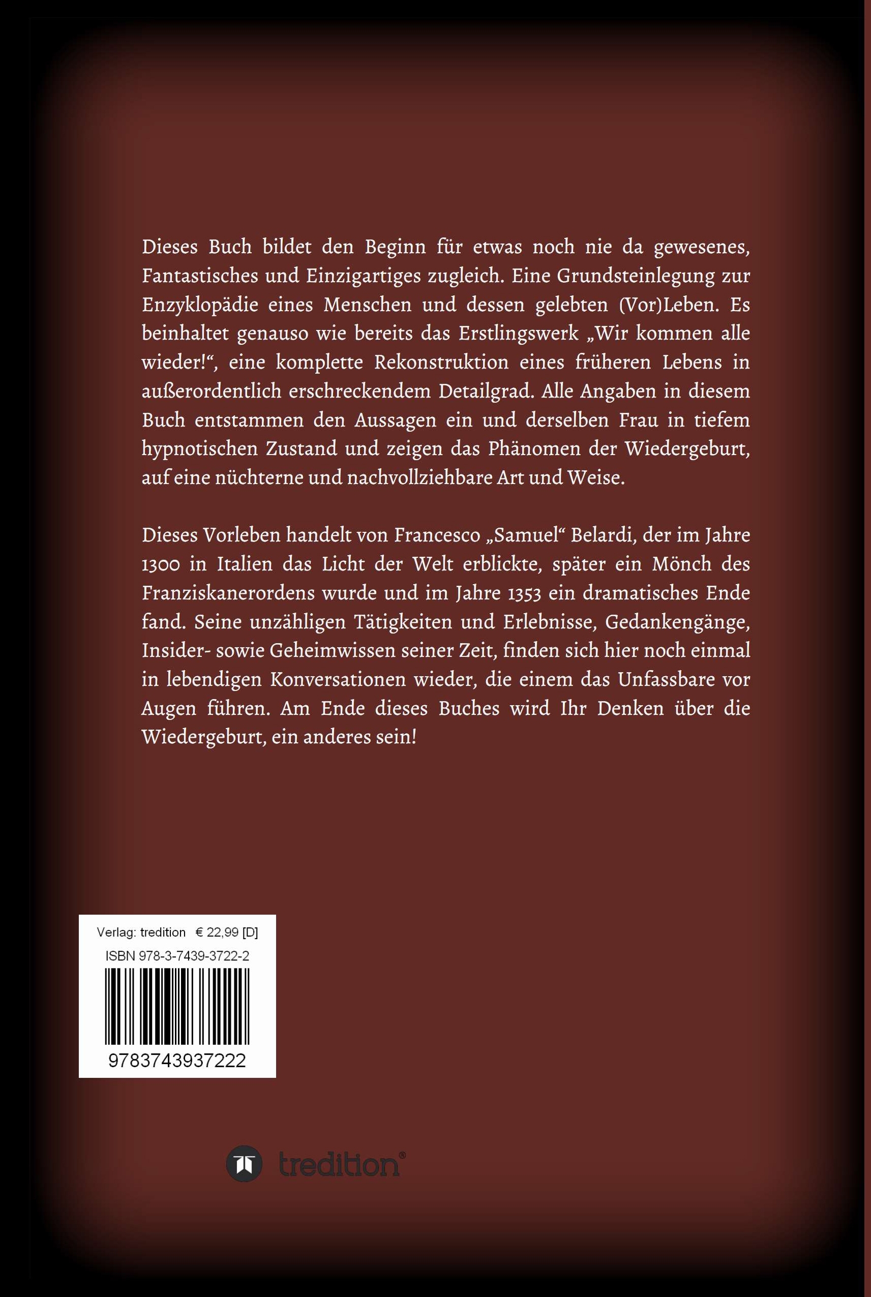 Dieses Buch bildet den Beginn für etwas noch nie da gewesenes, Fantastisches und Einzigartiges zugleich. Eine Grundsteinlegung zur Enzyklopädie eines Menschen und dessen gelebten (Vor)Leben. Es beinhaltet genauso wie bereits das Erstlingswerk "Wir kommen alle wieder!", eine komplette Rekonstruktion eines früheren Lebens in außerordentlich erschreckendem Detailgrad. Alle Angaben in diesem Buch entstammen den Aussagen ein und derselben Frau in tiefem hypnotischen Zustand und zeigen das Phänomen der Wiedergeburt, auf eine nüchterne und nachvollziehbare Art und Weise. Dieses Vorleben handelt von Francesco "Samuel" Belardi, der im Jahre 1300 in Italien das Licht der Welt erblickte, später ein Mönch des Franziskanerordens wurde und im Jahre 1353 ein dramatisches Ende fand. Seine unzähligen Tätigkeiten und Erlebnisse, Gedankengänge, Insider- sowie Geheimwissen seiner Zeit, finden sich hier noch einmal in lebendigen Konversationen wieder, die einem das Unfassbare vor Augen führen. Am Ende dieses Buches wird Ihr Denken über die Wiedergeburt, ein anderes sein!