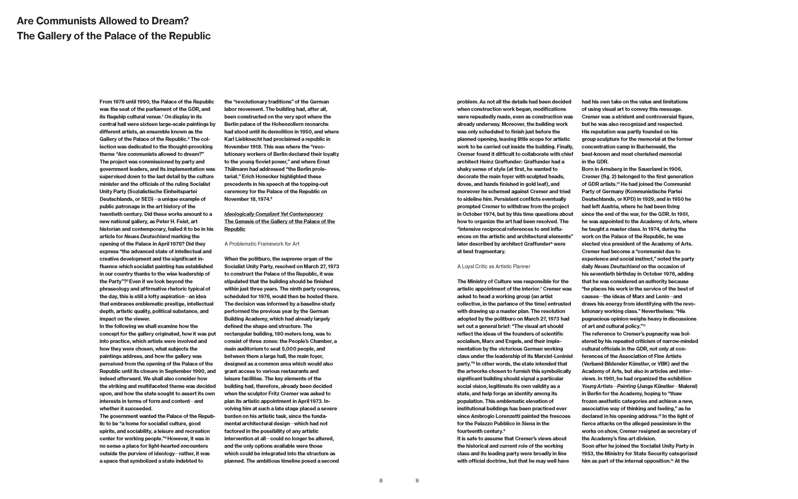 This collection of sixteen large-scale paintings, commissioned 1975 by the East German government, holds a mirror up to the social and political aims of former East Germany before the onset of reunification.The Palace of the Republic was opened in 1976 to house East Germany's parliament and to provide a cultural and historical center for the public to enjoy. During its construction, the government commissioned sixteen artists to create paintings in response to the question, "Are Communists allowed to dream?" Artists like Bernhard Heisig, Wolfgang Mattheuer, Willi Sitte, Werner Tübke, Walter Womacka, and Hans Vent contributed large-size works. They painted in their personal styles, but still stayed within the tradition of realistic painting in East Germany.With the fall of the wall and reunification, the paintings were removed from public view in 1990. The palace itself was demolished in 2006. This volume accompanies the first public exhibition of the paintings since 1995 and sheds new light on the East German government's understanding of art and its idea of self-representation.