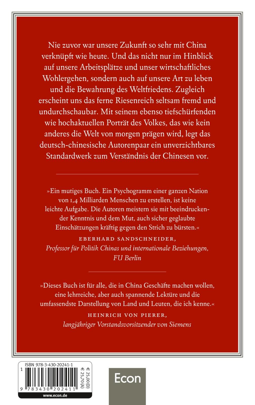 Das deutsch-chinesische Autorenpaar greift diesen Zwiespalt auf und zeichnet ein umfassendes Psychogramm einer Weltmacht. Dabei schlägt es den Bogen von den (geistes-)geschichtlichen Grundlagen über Erziehung und Sozialisation, Denken und Wahrnehmung, Sprache und Kommunikation, Moral und Sozialverhalten, Lebenseinstellung, Temperament und Geschlechterbeziehungen der Chinesen bis hin zu Wirtschaft und Arbeitswelt, Staat und Gesellschaft sowie den geopolitischen Ambitionen Chinas. Dieses Wissen hilft zu verstehen, wie die Chinesen "ticken" und wie wir den Herausforderungen begegnen, die Chinas scheinbar unaufhaltsamer Aufstieg für uns mit sich bringt.