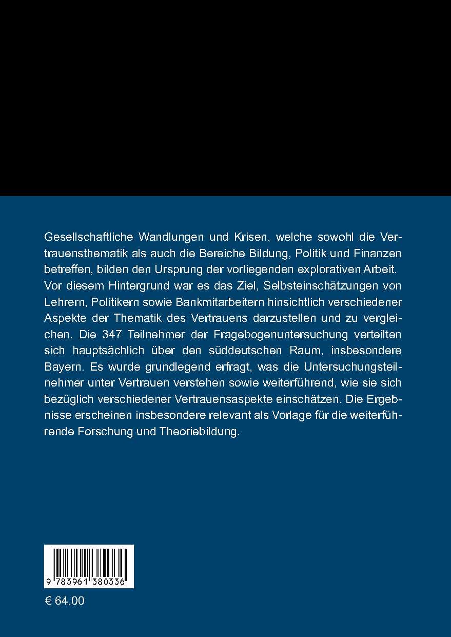 | Schlagworte | Selbstvertrauen • Systemvertrauen • Vertrauen • Vertrauen in die Politik • Vertrauen in die Wirtschaft • Vertrauensaspekte • zwischenmenschliches Vertrauen |