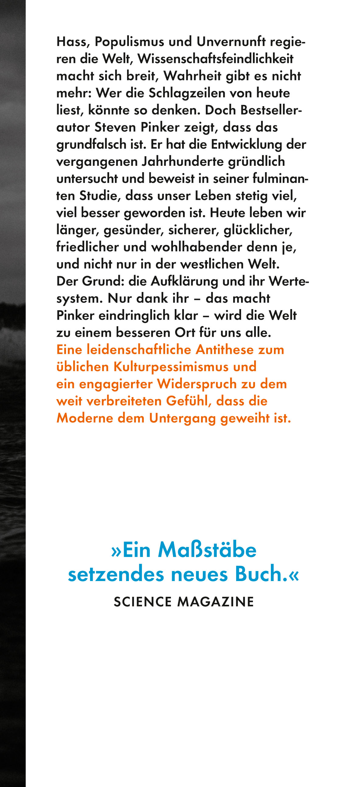 Hass, Populismus und Unvernunft regieren die Welt, Wissenschaftsfeindlichkeit macht sich breit, Wahrheit gibt es nicht mehr: Wer die Schlagzeilen von heute liest, könnte so denken. Doch Bestseller-Autor Steven Pinker zeigt, dass das grundfalsch ist. Er hat die Entwicklung der vergangenen Jahrhunderte gründlich untersucht und beweist in seiner fulminanten Studie, dass unser Leben stetig viel besser geworden ist. Heute leben wir länger, gesünder, sicherer, glücklicher, friedlicher und wohlhabender denn je, und nicht nur in der westlichen Welt. Der Grund: die Aufklärung und ihr Wertesystem.