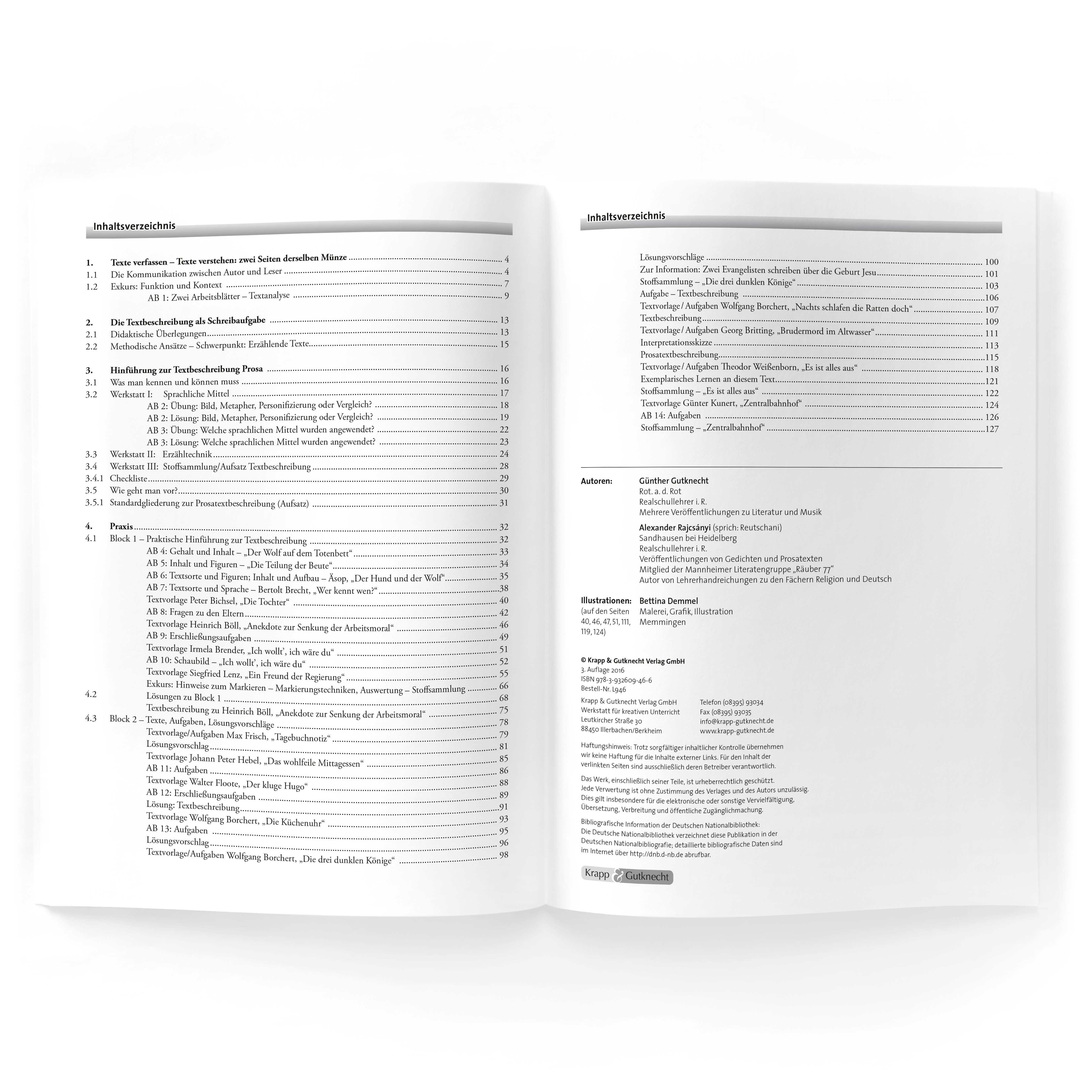 Das Lehrerheft setzt beim Kommunikationsmodell an und macht deutlich, dass Sprache ein Werkzeug ist, das von den Autoren in mannigfacher Gestalt zur Erreichung eines bestimmten Zweckes eingesetzt wird. Dieses »Werkzeug« gilt es in seinen vielfältigen Formen zu erkennen und zu bestimmen. Das Heft ist in zwei Teile gegliedert: Im ersten Teil werden an Beispielen die theoretischen Grundlagen für die Textbeschreibung gelegt. Der zweite Teil ist ein didaktisch-methodischer Praxisteil: Er enthält in einem ersten Block Texte und Aufgaben bzw. Arbeitsblätter, welche schrittweise die Schüler zur Textbeschreibung hinführen. Am Ende dieses Blockes sollten die Schüler/innen alle notwendigen Kompetenzen erworben haben, um vollständige Textbeschreibungen selbstständig zu verfassen. Die Lösungen zu den jeweiligen Aufgaben sind am Ende des Blockes zu finden. Eine Fülle von Kopiervorlagen zu Texten verschiedener Gattungen zum Üben nebst Lösungen bzw. Lösungsvorschlägen schließt sich an. Im Heft wird u. a. folgende Prosa behandelt: Äsop, Der Hund und der Wolf Bertolt Brecht, Wer kennt wen? Peter Bichsel, Die Tochter Heinrich Böll, Anekdote zur Senkung der Arbeitsmoral Irmela Brender, Ich wollt', ich wäre du Siegfried Lenz, Ein Freund der Regierung Max Frisch, Tagebuchnotiz Johann Peter Hebel, Das wohlfeile Mittagessen Wolfgang Borchert, Die Küchenuhr Wolfgang Borchert, Die drei dunklen Könige Wolfgang Borchert, Nachts schlafen die Ratten doch Geortg Britting, Brudermord im Altwasser Theodor Weißenborn, Es ist alles aus Günter Kunert, Zentralbahnhof