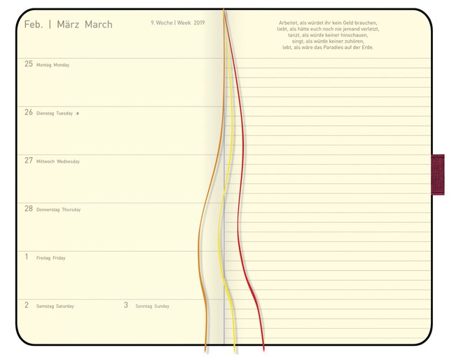 Edle 18-Monats-Agenda mit geprägtem Einband und ausgewählten Zitaten aus der Welt der Bücher und der Leselust. Auf der linken Seite die Wochenübersicht und auf der rechten Seite viel Platz für Notizen. Kalendarium von Oktober 2017 bis März 2019.