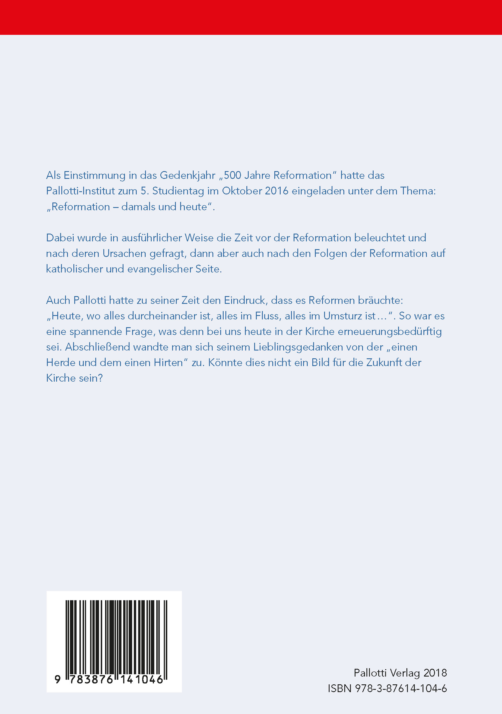 Als Einstimmung in das Gedenkjahr "500 Jahre Reformation" hatte das Pallotti- Institut zum 5. Studientag im Oktober 2016 eingeladen unter dem Thema: " Reformation - damals und heute".Dabei wurde in ausführlicher Weise die Zeit vor der Reformation beleuchtet und nach deren Ursachen gefragt, dann aber auch nach den Folgen der Reformation auf katholischer und evangelischer Seite.Auch Pallotti hatte zu seiner Zeit den Eindruck, dass es Reformen bräuchte:"Heute, wo alles durcheinander ist, alles im Fluss, alles im Umsturz ist ...". So war es eine spannende Frage, was denn bei uns heute in der Kirche erneuerungsbedürftig sei. Abschließend wandte man sich seinem Lieblingsgedanken von der "einenHerde und dem einen Hirten" zu. Könnte dies nicht ein Bild für die Zukunft der Kirche sein?