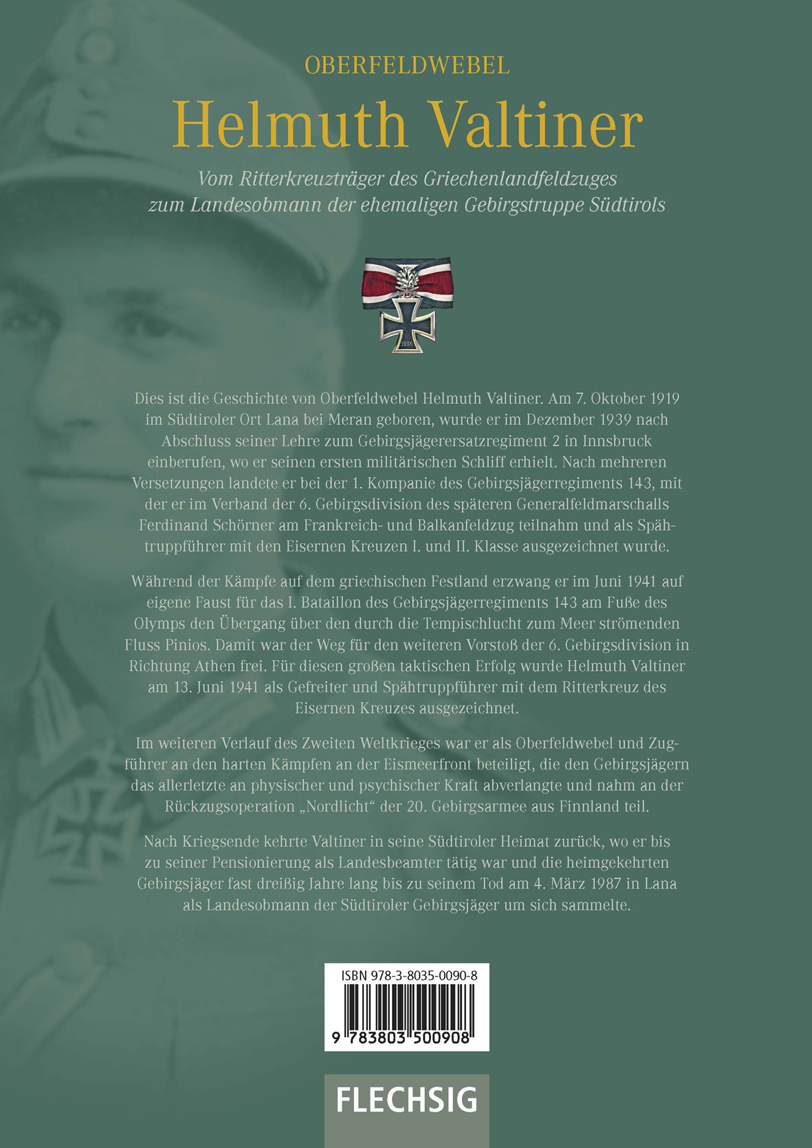 Dies ist die Geschichte von Oberfeldwebel Helmuth Valtiner. Am 7. Oktober 1919 im Südtiroler Ort Lana bei Meran geboren, wurde er im Dezember 1939 nach Abschluss seiner Lehre zum Gebirgsjägerersatzregiment 2 in Innsbruck einberufen, wo er seinen ersten militärischen Schliff erhielt. Nach mehreren Versetzungen landete er bei der 1. Kompanie des Gebirgsjägerregiments 143, mit der er im Verband der 6. Gebirgsdivision des späteren Generalfeldmarschalls Ferdinand Schörner am Frankreich- und Balkanfeldzug teilnahm und als Spähtruppführer mit den Eisernen Kreuzen I. und II. Klasse ausgezeichnet wurde.Während der Kämpfe auf dem griechischen Festland erzwang er im Juni 1941 auf eigene Faust für das I. Bataillon des Gebirgsjägerregiments 143 am Fuße des Olymps den Übergang über den durch die Tempischlucht zum Meer strömenden Fluss Pinios. Damit war der Weg für den weiteren Vorstoß der 6. Gebirgsdivision in Richtung Athen frei. Für diesen großen taktischen Erfolg wurde Helmuth Valtiner am 13. Juni 1941 als Gefreiter und Spähtruppführer mit dem Ritterkreuz des Eisernen Kreuzes ausgezeichnet.Im weiteren Verlauf des Zweiten Weltkrieges war er als Oberfeldwebel und Zugführer an den harten Kämpfen an der Eismeerfront beteiligt, die den Gebirgsjägern das allerletzte an physischer und psychischer Kraft abverlangte und nahm an der Rückzugsoperation "Nordlicht" der 20. Gebirgsarmee aus Finnland teil.Nach Kriegsende kehrte Valtiner in seine Südtiroler Heimat zurück, wo er bis zu seiner Pensionierung als Landesbeamter tätig war und die heimgekehrten Gebirgsjäger fast dreißig Jahre lang bis zu seinem Tod am 4. März 1987 in Lana als Landesobmann der Südtiroler Gebirgsjäger um sich sammelte.