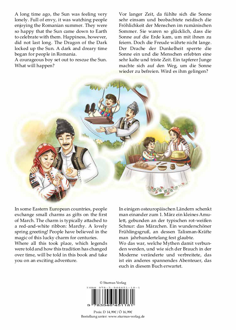 Where all this took place, which legends were told and how this tradition has changed over time will be told in this book and take you on an exciting adventure. Vor langer Zeit, da fühlte sich die Sonne sehr einsam und beobachtete neidisch die Fröhlichkeit der Menschen im rumänischen Sommer. Sie waren so glücklich, dass die Sonne auf die Erde kam, um mit ihnen zu feiern. Doch die Freude währte nicht lange. Der Drache der Dunkelheit sperrte die Sonne ein und die Menschen erlebten eine sehr kalte und triste Zeit.