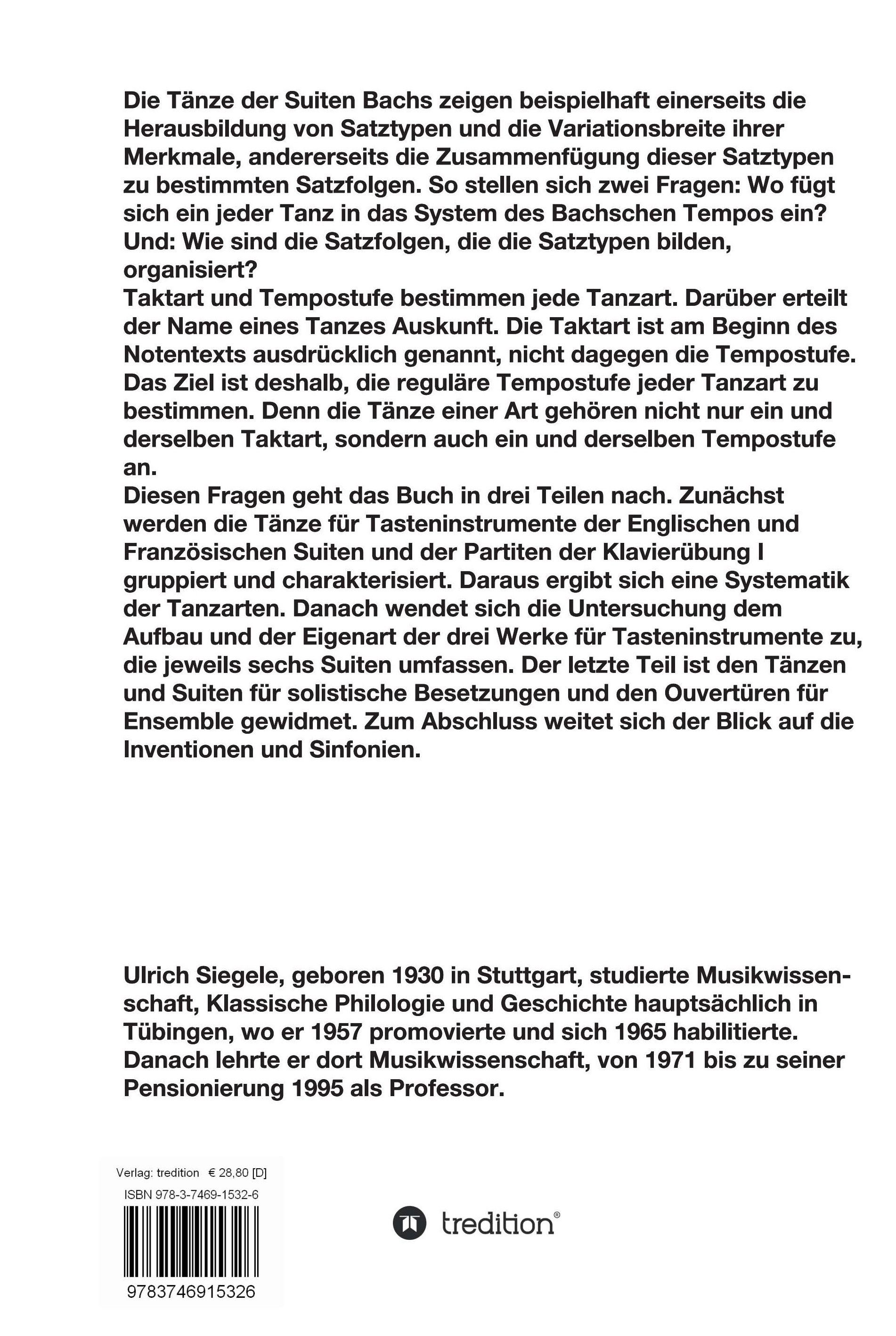 Ulrich Siegele, geboren 1930 in Stuttgart, studierte Musikwissenschaft, Klassische Philologie und Geschichte hauptsächlich in Tübingen, wo er 1957 promovierte und sich 1965 habilitierte. Danach lehrte er dort Musikwissenschaft, von 1971 bis zu seiner Pensionierung 1995 als Professor. Seine Hauptarbeitsgebiete sind historische Kompositionsverfahren, vor allem die Konstruktion von Form im Hinblick auf Dauer und funktionale Differenzierung, besonders bei J. S. Bach, Monteverdi, Schütz, Beethoven, Wagner und in der seriellen Musik des 20. Jahrhunderts, sowie die Biographie J. S. Bachs in ihrem politischen, sozialen und ökonomischen Kontext. Sein analytischer Ansatz stellt sich entschieden auf den Standpunkt des Komponisten und entschlüsselt dessen Problemstellungen und Lösungsstrategien mit dem Ziel, strukturelle Ebenen eines Musikstücks klarzulegen und dadurch der kompositionstechnischen und nach Möglichkeit der ästhetischen Wahrnehmung zugänglich zu machen. Seine Untersuchungen zur Zeitstruktur in J. S. Bachs Musik beruhen auf der Überzeugung, dass das Tempo eines Stücks wie dessen andere Parameter dem Notentext einbeschrieben ist und aus den Satztypen der Komposition präzise erhoben werden kann.