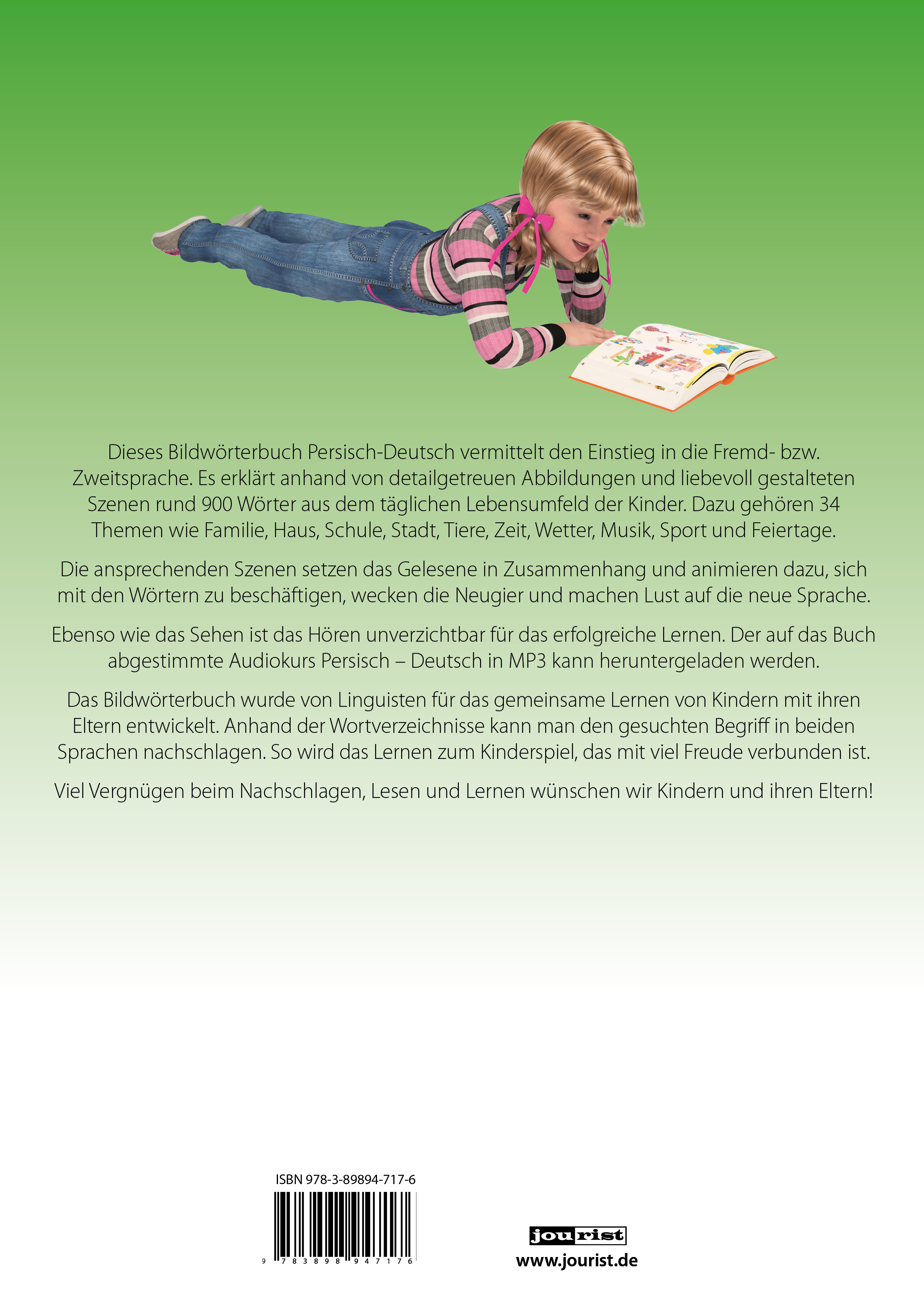 Dieses Bildwörterbuch Persisch-Deutsch vermittelt den Einstieg in die Fremd- bzw. Zweitsprache. Es erklärt anhand von detailgetreuen Abbildungen und liebevoll gestalteten Szenen rund 900 Wörter aus dem täglichen Lebensumfeld der Kinder. Dazu gehören 34 Themen wie Familie, Haus, Schule, Stadt, Tiere, Zeit, Wetter, Musik, Sport und Feiertage.
