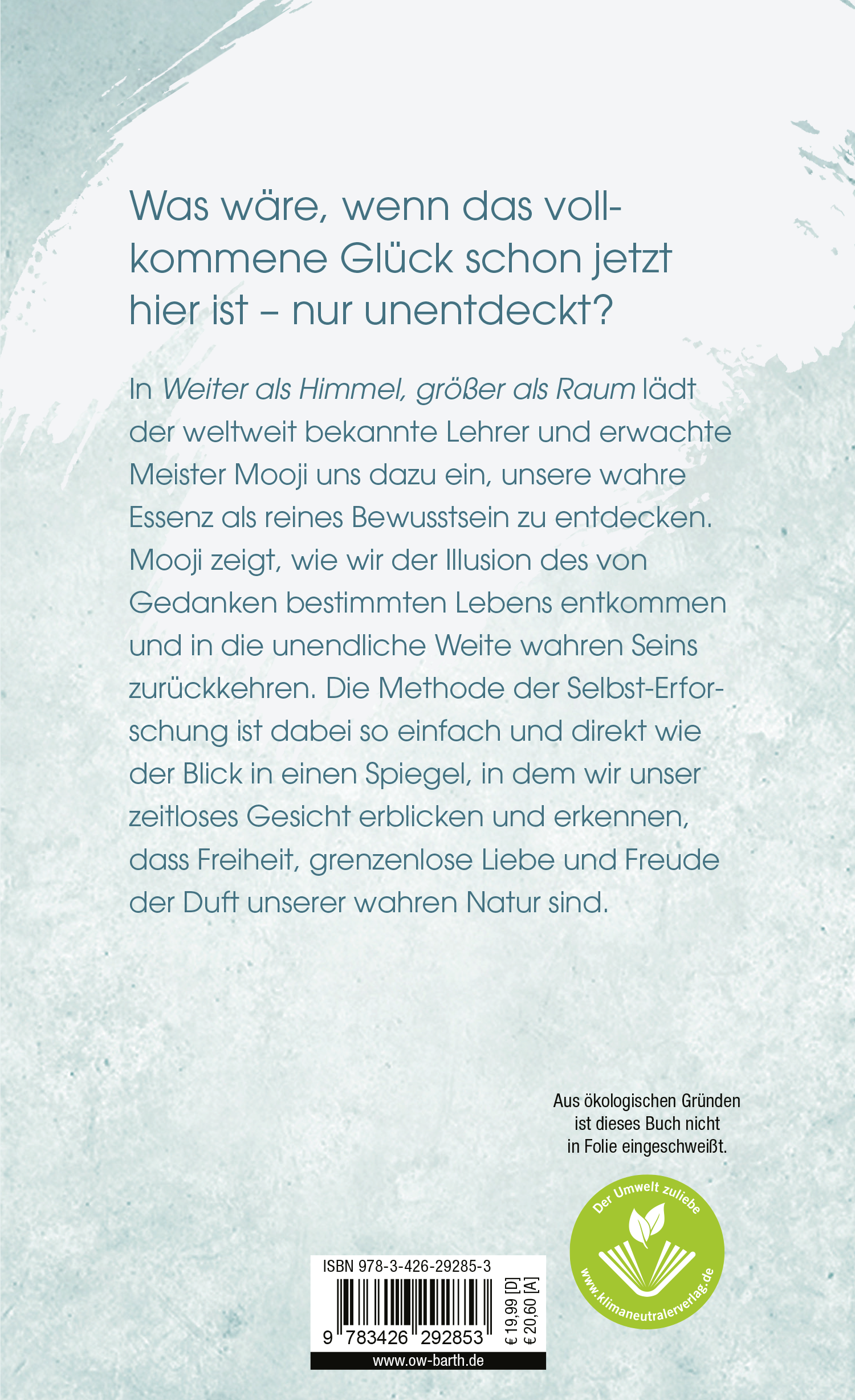 In Weiter als Himmel, größer als Raum gehen wir uns selbst auf den Grund und finden unsere tiefste innere Wahrheit. Moojis Buch zu lesen, ist fast wie eine Begegnung mit dem Meister selbst, weil wir in ihr die eigene Natur und Existenz hinterfragen. Wir können durch seine gezielten Fragen und praktischen Übungs-Vorschläge direkt über unser Ego hinauswachsen und wahren Frieden und Glückseligkeit erleben. Für alle Sinnsucher, die sich selbst erkennen wollen und für die Erleuchtung ein reales Ziel darstellt.