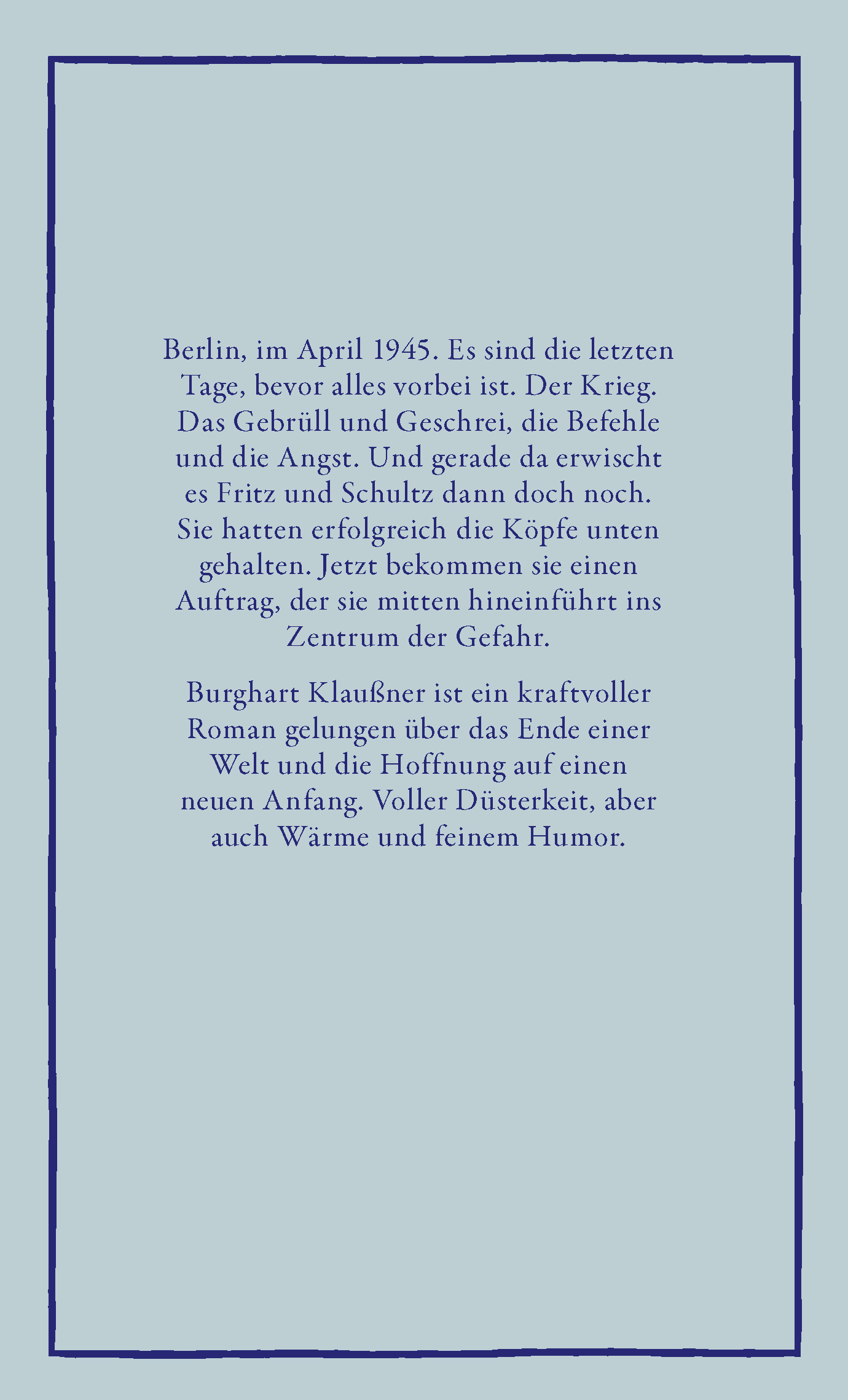 »Bezwingend wie Klaußner den Irrsinn der letzten Kriegstage einfängt [...] Der Autor verkneift sich alles Abschweifende und Ausschmückende [...] Ein Erzählen, das bei aller Lakonie im Tonfall und Schnörkellosigkeit der Dramaturgie erstaunlichen atmosphärischen Reichtum entfaltet. Burghart Klaußner erweist sich als hoch talentierter Debütant, der mit knappen Strichen Stimmungen zu zeichnen versteht und dabei gekonnt Sinneseindrücke und Emotionen miteinander verwebt.«