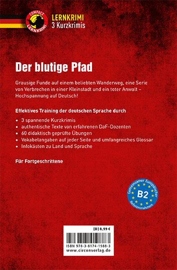 Sie lernen schon seit einiger Zeit Deutsch und möchten Ihre Sprachkenntnisse verbessern oder vorhandenes Wissen auffrischen? Sie wollen Ihre Kenntnisse der deutschen Sprache vertiefen und dabei unterhalten werden? Sie lieben spannende Geschichten und wollen Texte lesen, die Ihnen ein authentisches Gefühl für die deutsche Sprache vermitteln? Dann sind unsere Lernkrimi Kurzkrimis genau das Richtige für Sie. In "Der blutige Pfad" erwarten Sie drei spannende Kriminalfälle, die von muttersprachlichen Autor*innen speziell für das Sprachniveau B2 und Deutsch als Fremdsprache (DaF) aufbereitet wurden. Mit dem einzigartigen Lernkonzept erwerben Sie spielerisch Sprachkompetenzen. Gehen Sie auf Verbrecherjagd und verbessern Sie ganz nebenbei Ihren Wortschatz, vertiefen Sie Ihre Grammatikkenntnisse und erfahren Sie Wissenswertes über Land und Sprache. Speziell konzipierte, textbezogene Übungen wechseln sich mit nützlichem Wissen rund um Land und Sprache ab und verstärken den Lerneffekt. So geht Sprachenlernen ganz nebenbei!