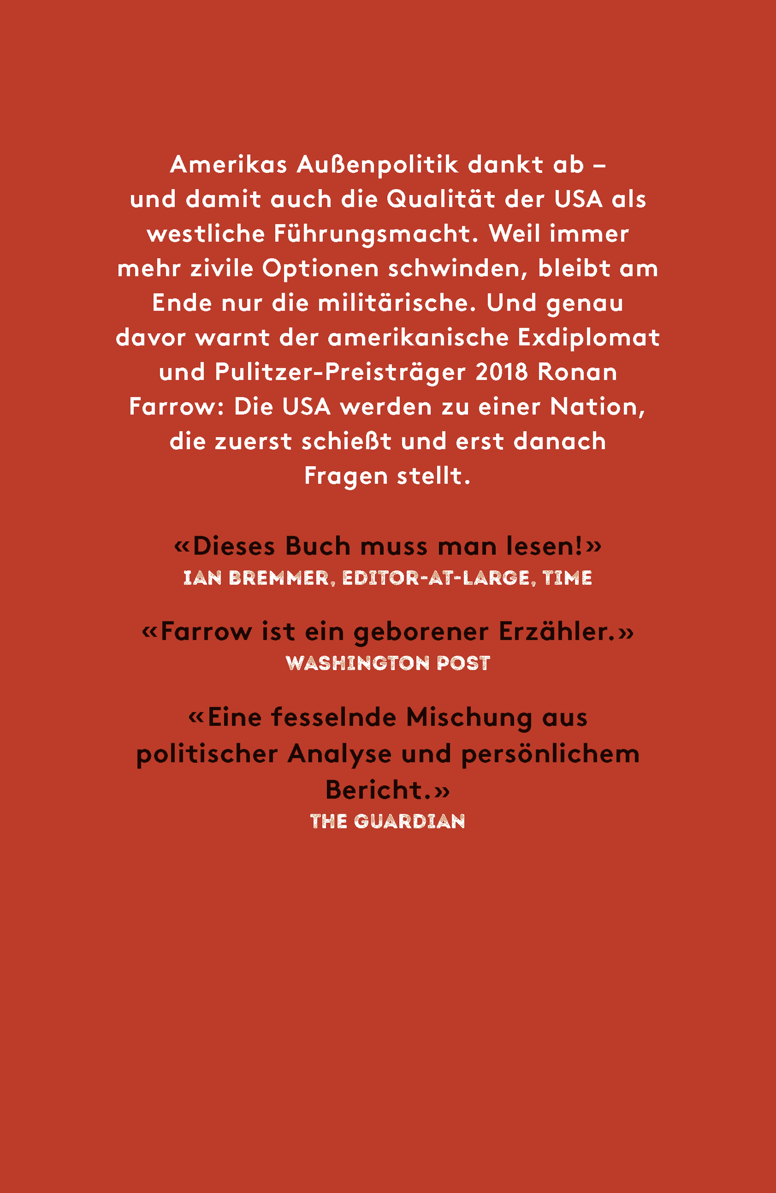 Die Außenpolitik des klassischen Typs – zivile Kanäle zum Zwecke von Friedenspolitik aufzubauen und zu pflegen – steht vor dem Ende. Ronan Farrow weiß, wovon er spricht, denn er war als Diplomat und Sonderberater sowohl in Washington als auch in Afghanistan und dem Nahen Osten tätig. Gestützt auf seine Erfahrungen während seiner aktiven Zeit als Diplomat und seine journalistischen Recherchereisen danach, enthüllt er eine Wende in der US-Außenpolitik nach dem 11. September 2001, die bisher kaum wahrgenommen, geschweige denn mit ihren gefährlichen Konsequenzen verstanden worden ist.