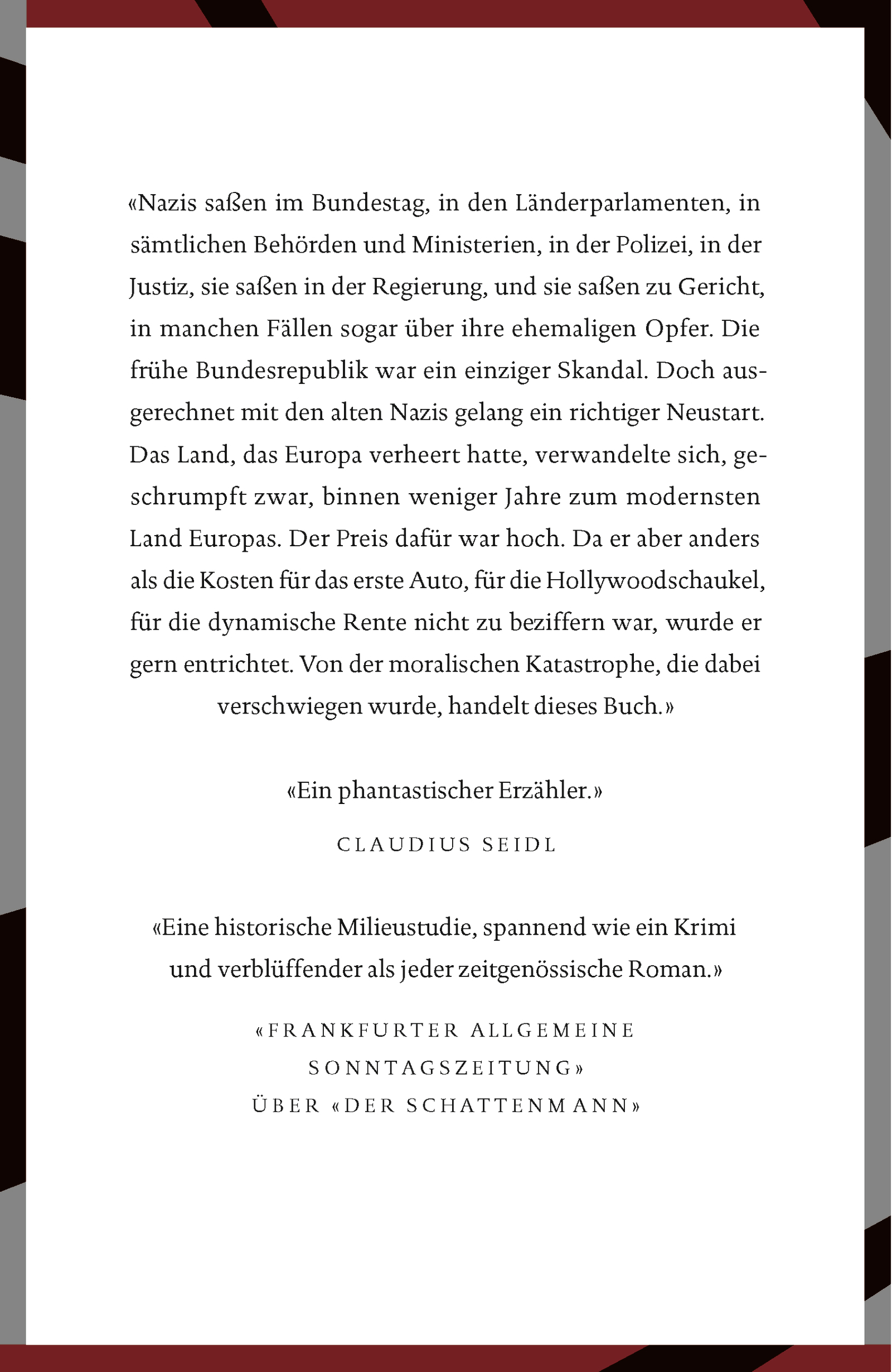 Sie hatten ihre Karriere im Dienste des NS-Staates begonnen – und setzten sie bruchlos in der der neuen Bundesrepublik fort. So bereitwillig sie der braunen Ideologie gedient hatten, so engagiert traten sie nun für die Demokratie ein. Kriegsgerichtsräte fällten wieder ihre Urteile, einst regimetreue Professoren lehrten und die Journalisten aus den früheren Propagandakompanien schrieben, als hätten sie sich nichts vorzuwerfen. Damit gewann der junge Staat zwar politische Handlungsfreiheit zurück, gründete seinen Erfolg aber auf einen moralischen Widerspruch, der nicht aufzulösen war: Die Demokratie wurde mitaufgebaut von ihren Feinden.
