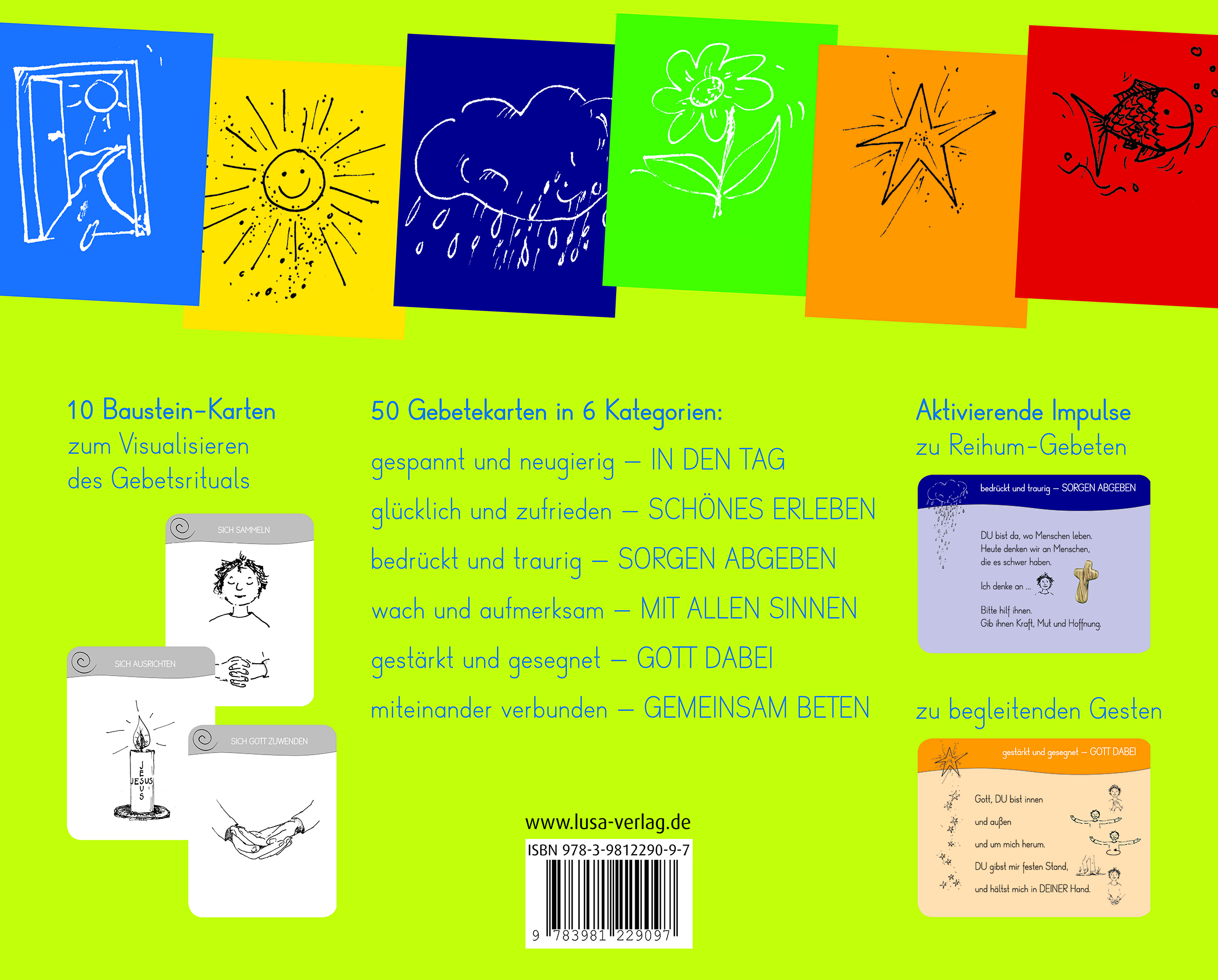 Die Gebete-Box für die Grundschule gibt Kindern und Lehrkräften ein durchdachtes und aktivierendes Hilfsmittel an die Hand, das die Entwicklung einer Gebetspraxis kontinuierlich und kindgemäß begleitet. 50 ästhetisch gestaltete Gebetekarten motivieren Grundschulkinder zur Auswahl, zu begleitenden Bewegungen und insbesondere auch zu eigenen Gebetsanliegen. 10 Bausteinkarten veranschaulichen den Ablauf eines Gebetsrituals und sensibilisieren dabei für die innere Haltung beim Gebet. Ein Begleitheft bietet viele Anregungen und Ideen zum Umgang mit der Gebete-Box und für das Thema Gebet im Unterricht. Alles ist untergebracht in einer ansprechenden und praktischen Schuberbox.
