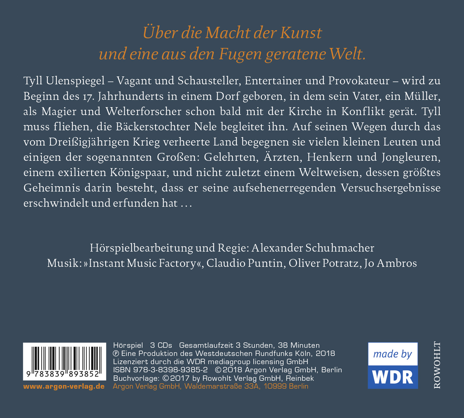 Tyll Ulenspiegel - Vagant und Schausteller, Entertainer und Provokateur - wird zu Beginn des 17. Jahrhunderts in einem Dorf geboren, in dem sein Vater, ein Müller, als Magier und Welterforscher schon bald mit der Kirche in Konflikt gerät. Tyll muss fliehen, die Bäckerstochter Nele begleitet ihn. Auf ihren Wegen durch das vom Dreißigjährigen Krieg verheerte Land begegnen sie vielen kleinen Leuten und einigen der sogenannten Großen: Gelehrten, Ärzten, Henkern und Jongleuren, einem exilierten Königspaar und nicht zuletzt einem Weltweisen, dessen größtes Geheimnis darin besteht, dass er seine aufsehenerregenden Versuchsergebnisse erschwindelt und erfunden hat ...