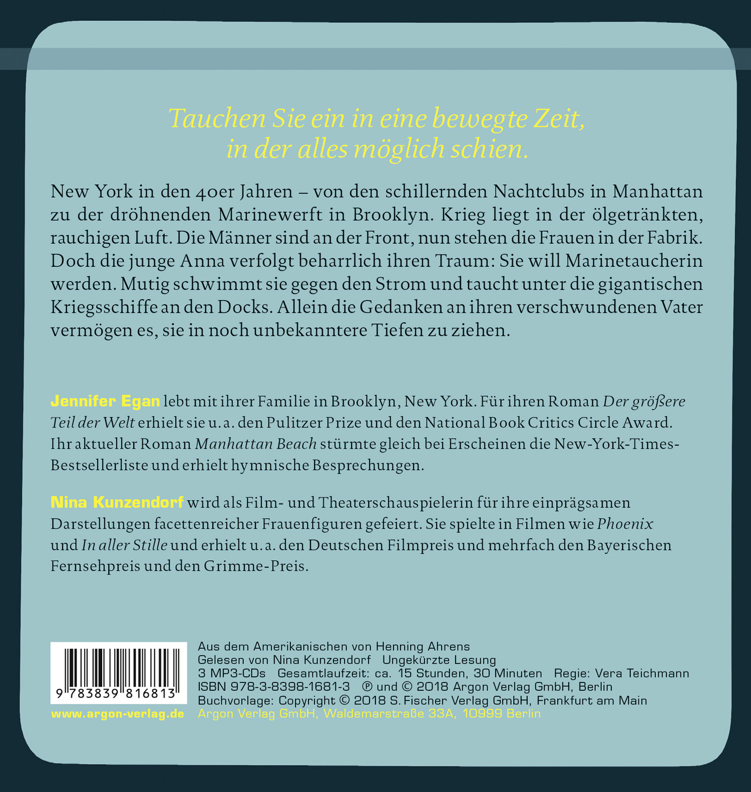 | Schlagworte | Bestseller • Bronx • Brooklyn • Docks • Epos • Fabrik • Gangster • Gegen den Strom • Geheimnis • Heldin • Junge Frau • Krieg • Kriegsschiffe • Long Island • Mafia • Manhattan • männerdominiert • Marinewerft • Meer • Nachtclub • Naval Yard • New York • Roman • Schwimmen • See • Strand • Tauchen • Taucherin • Unterwelt • Vater • Villen • Weltwirtschaftskrise • Zeitpanorama • Zweiter Weltkrieg |