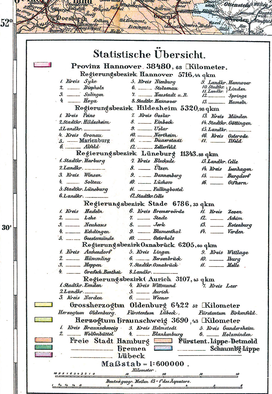| Schlagworte | Aschendorf, Hümmling, Meppen, Grafschaft Bentheim, Lingen, Wittlage, Iburg, Melle sowie dem Stadt- und Landkreis Osnabrück • Braunschweig, Wolfenbüttel, Helmstedt, Blankenburg, Gandersheim und Holminden, Herzogtum Oldenburg, dem Fürstentum Lübeck und Birkenfeld • Fürstentum Birkenfeld, Syke, Diepholz, Sulingen, Hoya, Nienburg, Stolzenau, Neustadt a. R., Stadtkreise Hannover und Linden, Landkreis Linden, Springe und Hameln. • Hadeln, Lehe, Nauhaus, Kehdingen, Geestenmünde, Bremervörde, Stade, Jork, Blumenthal, Osterholz, Zeven, Achim, Rotenburg und Verden • Hamburg, Bremen und Lübeck sowie die Fürstentümer Lippe-Detmold und Schaumburg-Lippe. REGIERUNGSBEZIRK BRAUNSCHWEIG mit den Kreisen Norden, Wittmund, Aurich, Weener, Leer sowie dem Stadt- und Landkreis Emden, • Peine, Gronau, Marienburg, Alfeld, Goslar, Einbeck, Uslar, Northeim, Duderstadt, Zellfeld, Münden, Osterode und Ilfeld, den Land- und Stadtkreisen Hildesheim und Göttingen • Winsen, Soltau, Bleckede, Ülzen, Dannenberg, Lüchow, Fallingbostel, Isenhagen, Burgdorf und Gifhorn, den Stadt- und Landkreisen Harburg und Lüneburg sowie dem Landkreis Celle |
