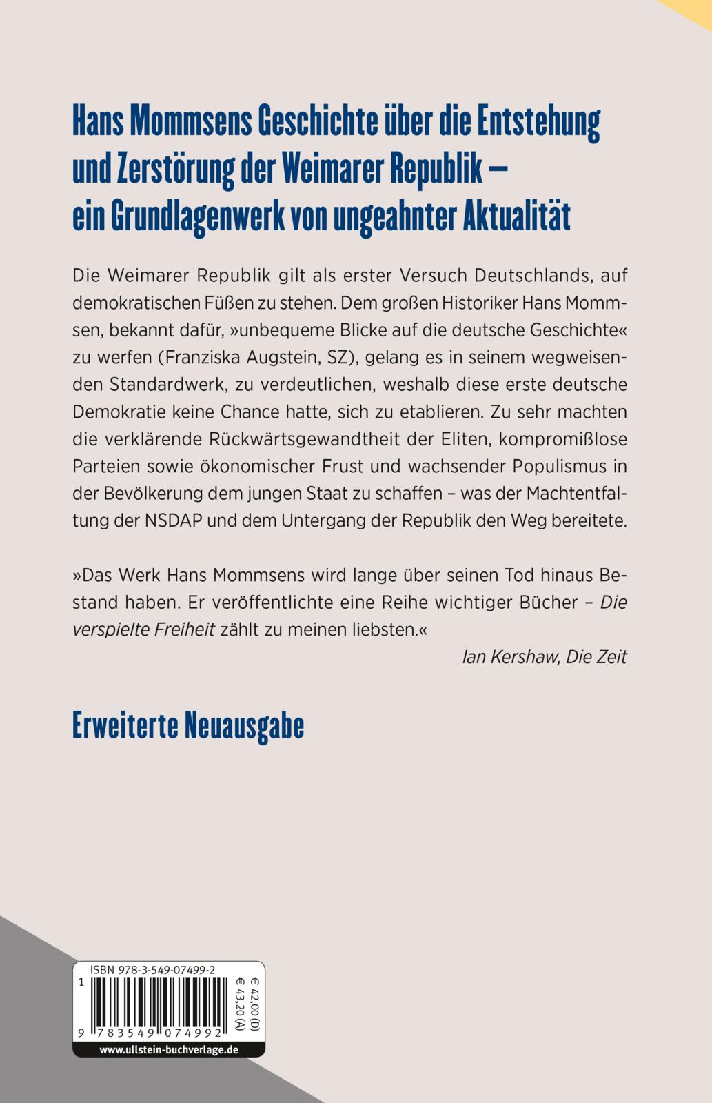 Die Weimarer Republik gilt als erster Versuch Deutschlands, auf demokratischen Füßen zu stehen. Dem großen Historiker Hans Mommsen, bekannt dafür, "unbequeme Blicke auf die deutsche Geschichte" zu werfen (Franziska Augstein, SZ), gelang es in seinem bis heute wegweisenden Standardwerk, pointiert zu verdeutlichen, weshalb diese erste deutsche Demokratie keine reelle Chance hatte, sich zu etablieren. Zu sehr machten die verklärende Rückwärtsgewandtheit der Eliten, kompromisslose Parteien, der ökonomischer Frust und wachsender Populismus in der Bevölkerung dem jungen Staat zu schaffen - was der Machtentfaltung der NSDAP und dem Untergang der Republik den Weg bereitete.