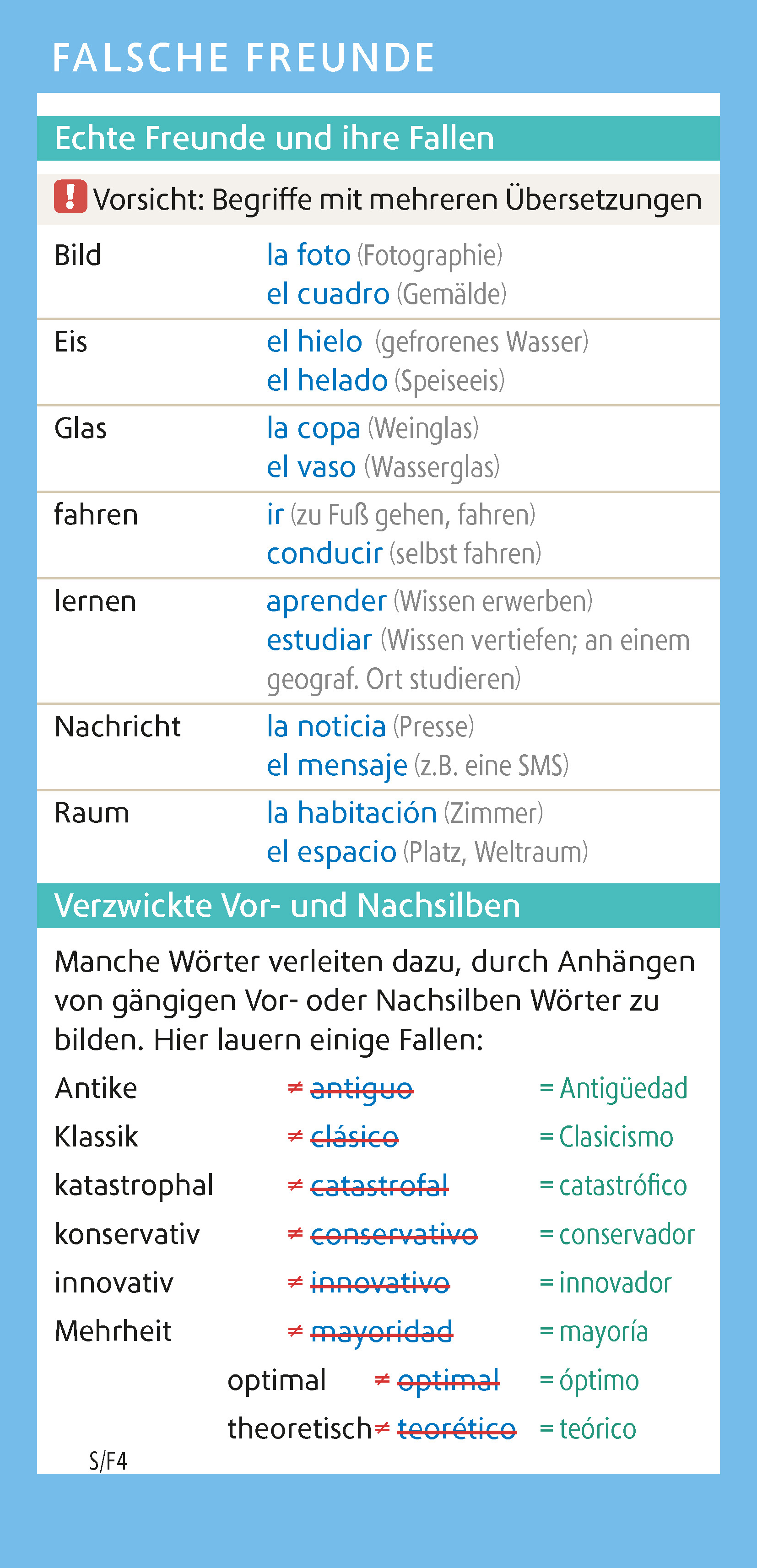 | Schlagworte | auf einen Blick • Fächer • Fallen vermeiden • Fehler vermeiden • Schule • Spanisch lernen • Spanisch Typische Fehler • Stolpersteine Spanisch • unterwegs lernen |
