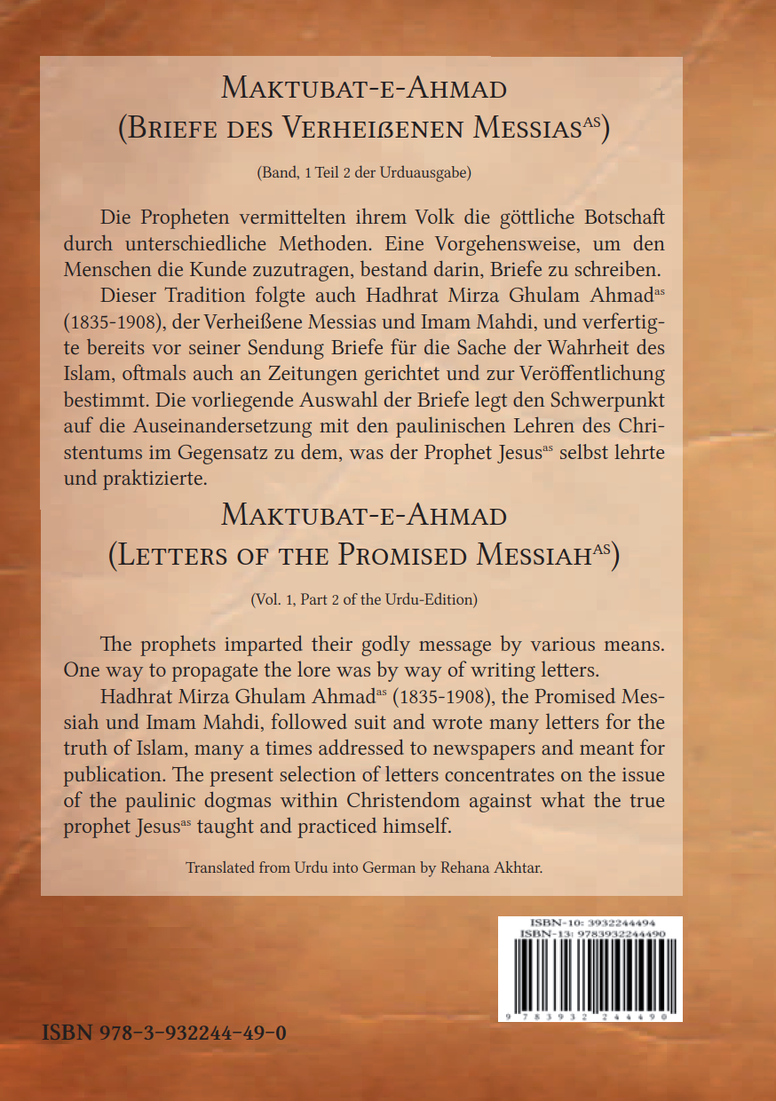 Die Propheten vermittelten ihrem Volk die göttliche Botschaft durch unterschiedliche Methoden. Eine Vorgehensweise, um den Menschen die Kunde zuzutragen, bestand darin, Briefe zu schreiben. Dieser Tradition folgte auch Hadhrat Mirza Ghulam Ahmad (1835-1908), der Verheißene Messias und Imam Mahdi, und verfertigte bereits vor seiner Sendung Briefe für die Sache der Wahrheit des Islam, oftmals auch an Zeitungen gerichtet und zur Veröffentlichung bestimmt. Die vorliegende Auswahl der Briefe legt den Schwerpunkt auf die Auseinandersetzung mit den paulinischen Lehren des Christentums im Gegensatz zu dem, was der Prophet Jesus selbst lehrte und praktizierte.
