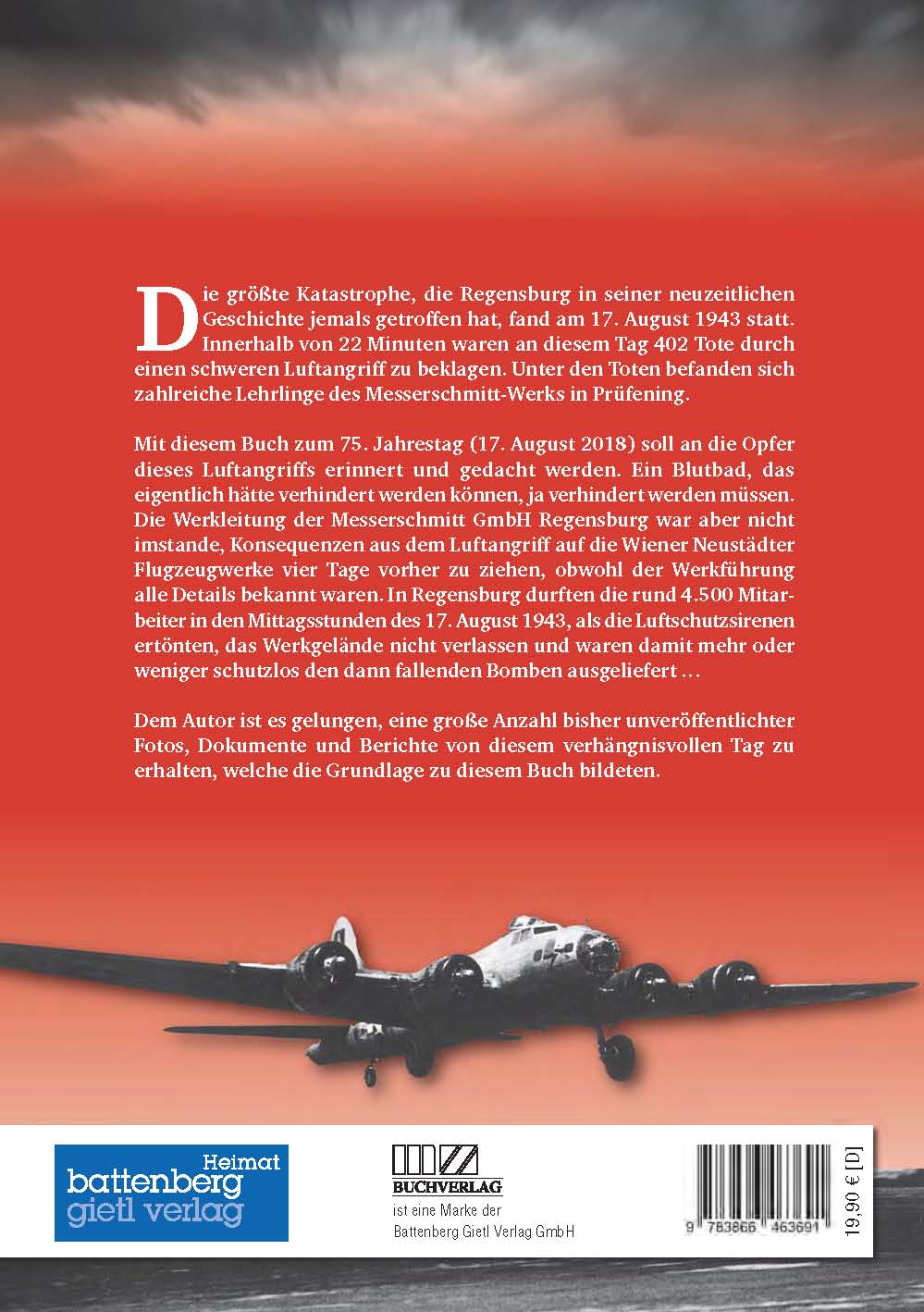 Die größte Katastrophe, die Regensburg in seiner neuzeitlichen Geschichte jemals getroffen hat, fand am 17. August 1943 statt. Innerhalb von 22 Minuten waren an diesem Tag 402 Tote durch einen schweren Luftangriff zu beklagen. Unter den Toten befanden sich zahlreiche Lehrlinge des Messerschmitt-Werks in Prüfening. Mit diesem Buch zum 75. Jahrestag (17. August 2018), soll an die Opfer dieses Luftangriffs erinnert und gedacht werden. Ein Blutbad, dass eigentlich hätte verhindert werden können, ja verhindert werden müssen. Die Werkleitung der Messerschmitt GmbH Regensburg war aber nicht im Stande, Konsequenzen aus dem Luftangriff auf die Wiener Neustädter Flugzeugwerke vier Tage vorher zu ziehen, obwohl alle Details der Werkführung bekannt waren. In Regensburg durften die rund 4.500 Mitarbeiter in den Mittagsstunden des 17. August 1943, als die Luftschutzsirenen ertönten, das Werkgelände nicht verlassen und waren damit mehr oder weniger schutzlos den dann fallenden Bomben ausgeliefert ... Dem Autor ist es gelungen, eine große Anzahl bisher unveröffentlichter Fotos, Dokumente und Berichte von diesem verhängnisvollen Tag zu erhalten, welche die Grundlage zu diesem Buch bildeten.