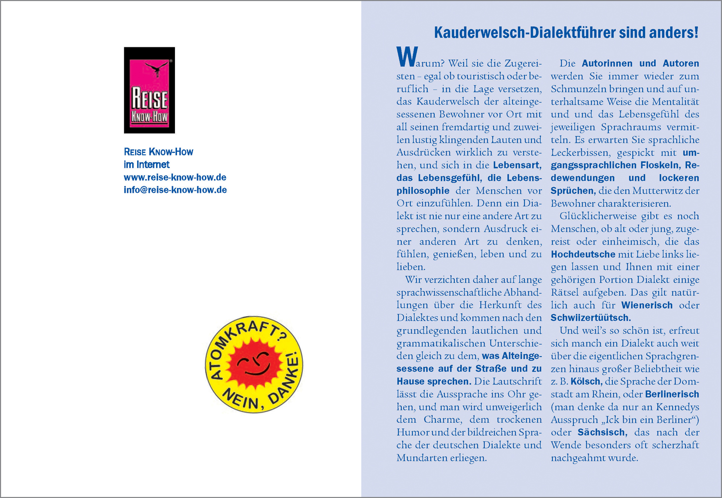 +++ Kauderwelsch Dialekt stellt deutsche Dialekte und Mundarten vor: die originellen Wörter, Redensarten, Wortspiele und Sprüche, die es in jeder Mundart gibt, den speziellen Humor der Menschen in einer Region und ihre Art zu reden. Dank der einfachen Lautschrift kann man auch als Ungeübter fast jeden Dialekt erlernen.