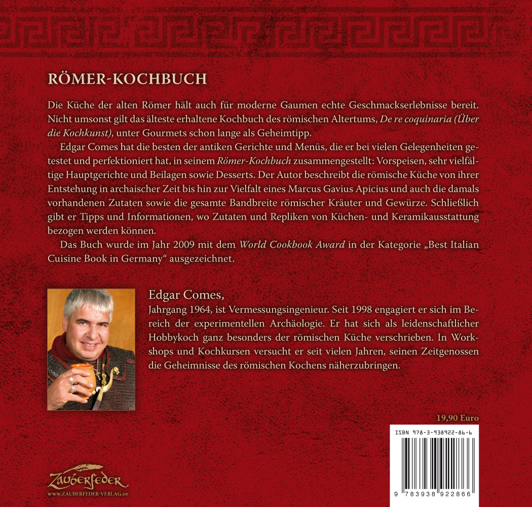 Die Küche der alten Römer hält auch für moderne Gaumen echte Geschmackserlebnisse bereit. Nicht umsonst gilt das älteste erhaltene Kochbuch des römischen Altertums, De re coquinaria (Über die Kochkunst), unter Gourmets schon lange als Geheimtipp.Edgar Comes hat die besten der antiken Gerichte und Menüs, die er bei vielen Gelegenheiten getestet und perfektioniert hat, in seinem Römer-Kochbuch zusammengestellt: Vorspeisen, sehr vielfältige Hauptgerichte und Beilagen sowie Desserts. Der Autor beschreibt die römische Küche von ihrer Entstehung in archaischer Zeit bis hin zur Vielfalt eines Marcus Gavius Apicius und auch die damals vorhandenen Zutaten sowie die gesamte Bandbreite römischer Kräuter und Gewürze. Schließlich gibt er Tipps und Informationen, wo Zutaten und Repliken von Küchen- und Keramikausstattung bezogen werden können.Das Buch wurde im Jahr 2009 mit dem World Cookbook Award in der Kategorie "Best Italian Cuisine Book in Germany" ausgezeichnet.