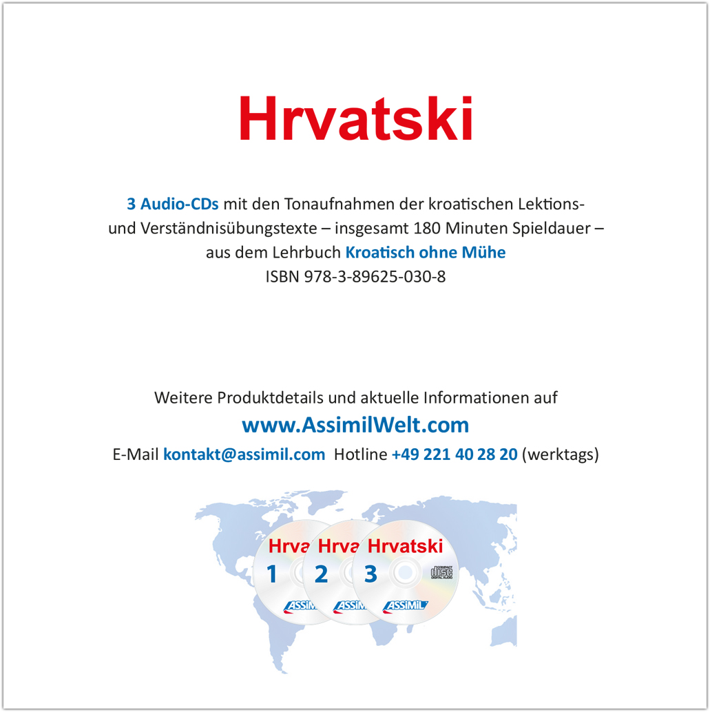 Die Audio-CDs (180 Minuten Spieldauer) enthalten die kroatischen Tonaufnahmen (Lektionstexte und Verständnisübungen) passend zum Lehrbuch "Kroatisch ohne Mühe". Die Aufnahmen wurden ausschließlich mit Muttersprachlern (allesamt professionelle Sprecherinnen und Sprecher) produziert. Die Sprechgeschwindigkeit ist dem jeweiligen Lektionsniveau angepasst.