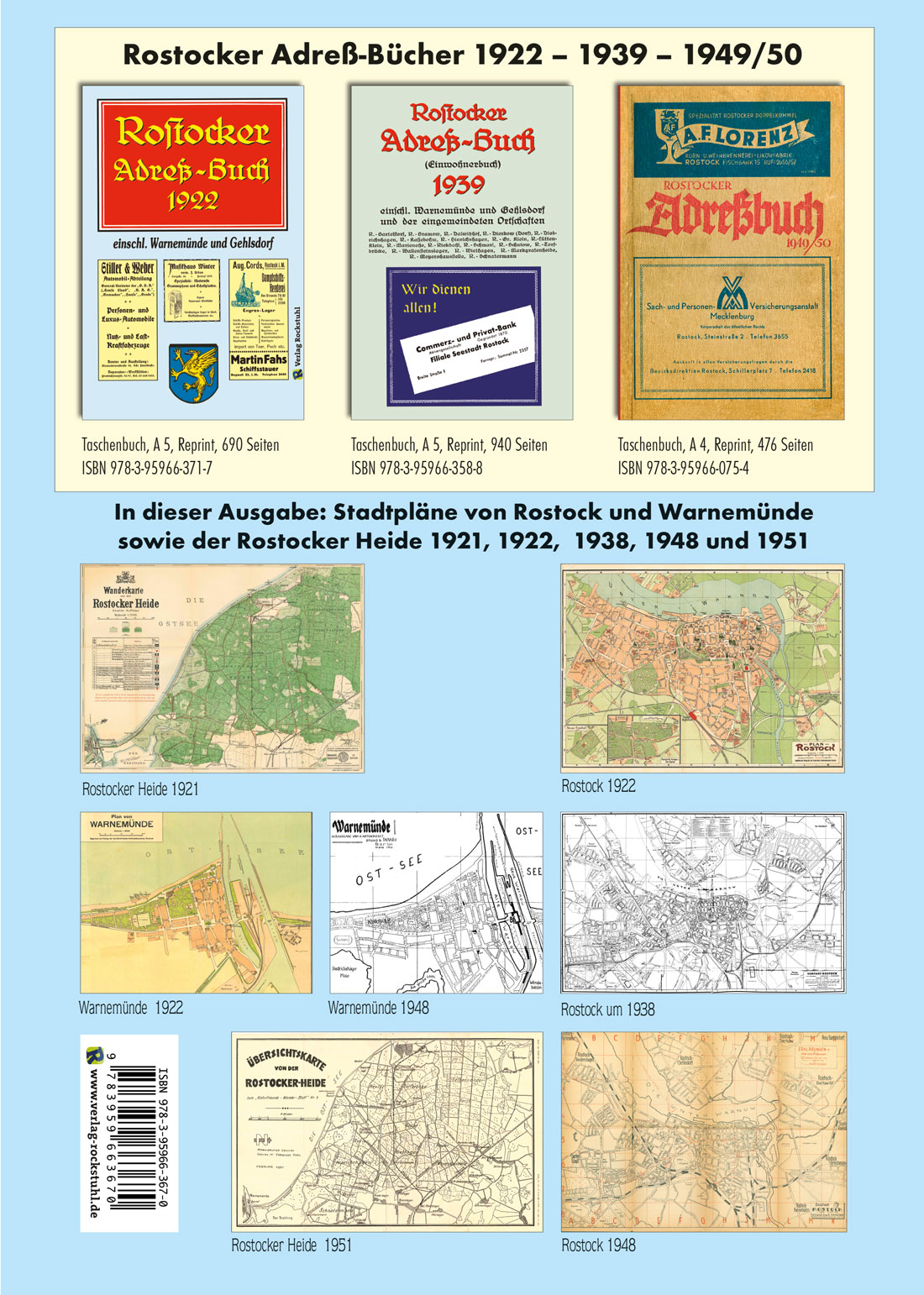 Herausgeber Harald Rockstuhl, Broschüre, A 4, 48 Seiten, Reprint der Stadtlpäne von 1922 – 1938 – 1948. Mit WARNEMÜNDE 1922 und 1948 sowie die ROSTOCKER HEIDE 1921 und 1951 stark vergrößert.