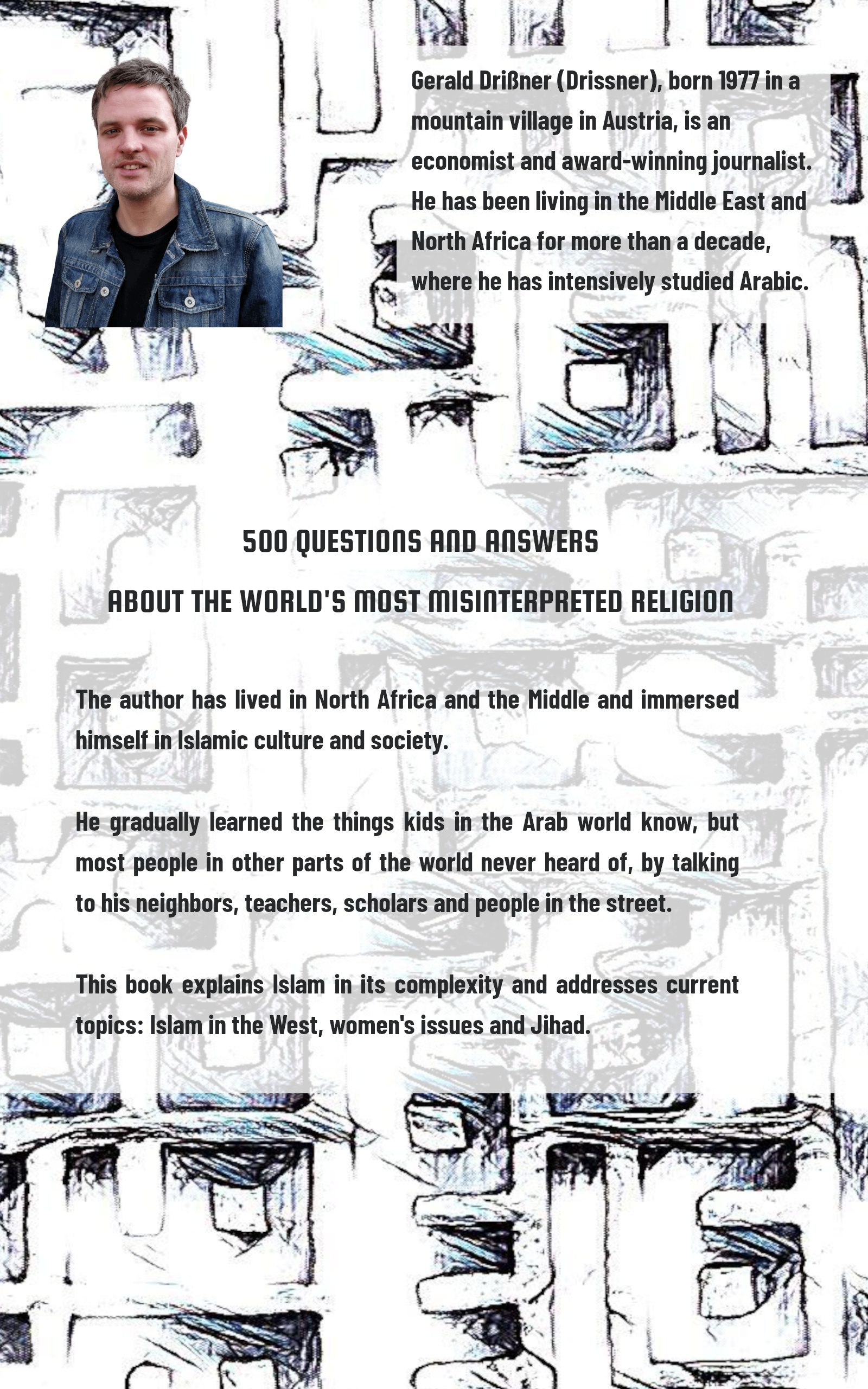 Gerald Drißner ist ein mehrfach ausgezeichneter Journalist und Buchautor. Er schreibt Texte aller Art und entwickelt digitale Inhalte und Auftritte. Außerdem schreibt und konzipiert er Bücher. Gerald Drißner, geboren 1977, ist im österreichischen Bergdorf Wald am Arlberg aufgewachsen. Er ist Diplom-Volkswirt und Arabist. Das journalistische Handwerk lernte er auf der Henri-Nannen-Journalistenschule. Er hat mehr als zehn Jahre in arabischen Ländern gelebt und dort Arabisch studiert.