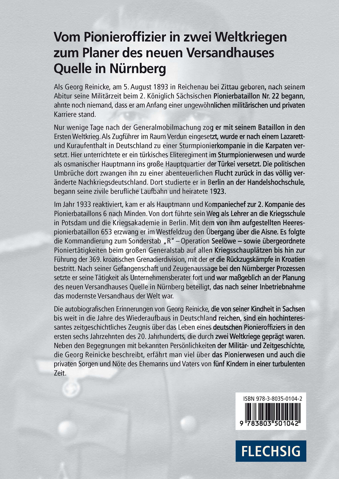 Als Georg Reinicke, am 5. August 1893 in Reichenau bei Zittau geboren, nach seinem Abitur seine Militärzeit beim 2. Königlich Sächsischen Pionierbataillon Nr. 22 begann, ahnte noch niemand, dass er am Anfang einer ungewöhnlichen militärischen und privaten Karriere stand. Nur wenige Tage nach der Generalmobilmachung zog er mit seinem Bataillon in den Ersten Weltkrieg. Als Zugführer im Raum Verdun eingesetzt, wurde er nach einem Lazarett- und Kuraufenthalt in Deutschland zu einer Sturmpionierkompanie in die Karpaten versetzt. Hier unterrichtete er ein türkisches Eliteregiment im Sturmpionierwesen und wurde als osmanischer Hauptmann ins große Hauptquartier der Türkei versetzt. Die politischen Umbrüche dort zwangen ihn zu einer abenteuerlichen Flucht zurück in das völlig veränderte Nachkriegsdeutschland. Dort studierte er in Berlin an der Handelshochschule, begann seine zivile berufliche Laufbahn und heiratete 1923. Im Jahr 1933 reaktiviert, kam er als Hauptmann und Kompaniechef zur 2. Kompanie des Pionierbataillons 6 nach Minden. Von dort führte sein Weg als Lehrer an die Kriegsschule in Potsdam und die Kriegsakademie in Berlin. Mit dem von ihm aufgestellten Heerespionierbataillon 653 erzwang er im Westfeldzug den Übergang über die Aisne. Es folgte die Kommandierung zum Sonderstab "R" - Operation Seelöwe - sowie übergeordnete Pioniertätigkeiten beim großen Generalstab auf allen Kriegsschauplätzen bis hin zur Führung der 369. kroatischen Grenadierdivision, mit der er die Rückzugskämpfe in Kroatien bestritt. Nach seiner Gefangenschaft und Zeugenaussage bei den Nürnberger Prozessen setzte er seine Tätigkeit als Unternehmensberater fort und war maßgeblich an der Planung des neuen Versandhauses Quelle in Nürnberg beteiligt, das nach seiner Inbetriebnahme das modernste Versandhaus der Welt war. Die autobiografischen Erinnerungen von Georg Reinicke, die von seiner Kindheit in Sachsen bis weit in die Jahre des Wiederaufbaus in Deutschland reichen, sind ein hochinteressantes zeitgeschichtliches Zeugnis über das Leben eines deutschen Pionieroffiziers in den ersten sechs Jahrzehnten des 20. Jahrhunderts, die durch zwei Weltkriege geprägt waren. Neben den Begegnungen mit bekannten Persönlichkeiten der Militär- und Zeitgeschichte, die Georg Reinicke beschreibt, erfährt man viel über das Pionierwesen und auch die privaten Sorgen und Nöte des Ehemanns und Vaters von fünf Kindern in einer turbulenten Zeit.
