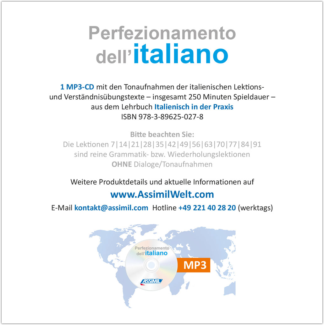 Die MP3-CD (250 Minuten Spieldauer) enthält die italienischen Tonaufnahmen (Lektionstexte und Verständnisübungen) passend zum Lehrbuch "Italienisch in der Praxis". Die Aufnahmen wurden ausschließlich mit Muttersprachlern (allesamt professionelle Sprecherinnen und Sprecher) produziert.