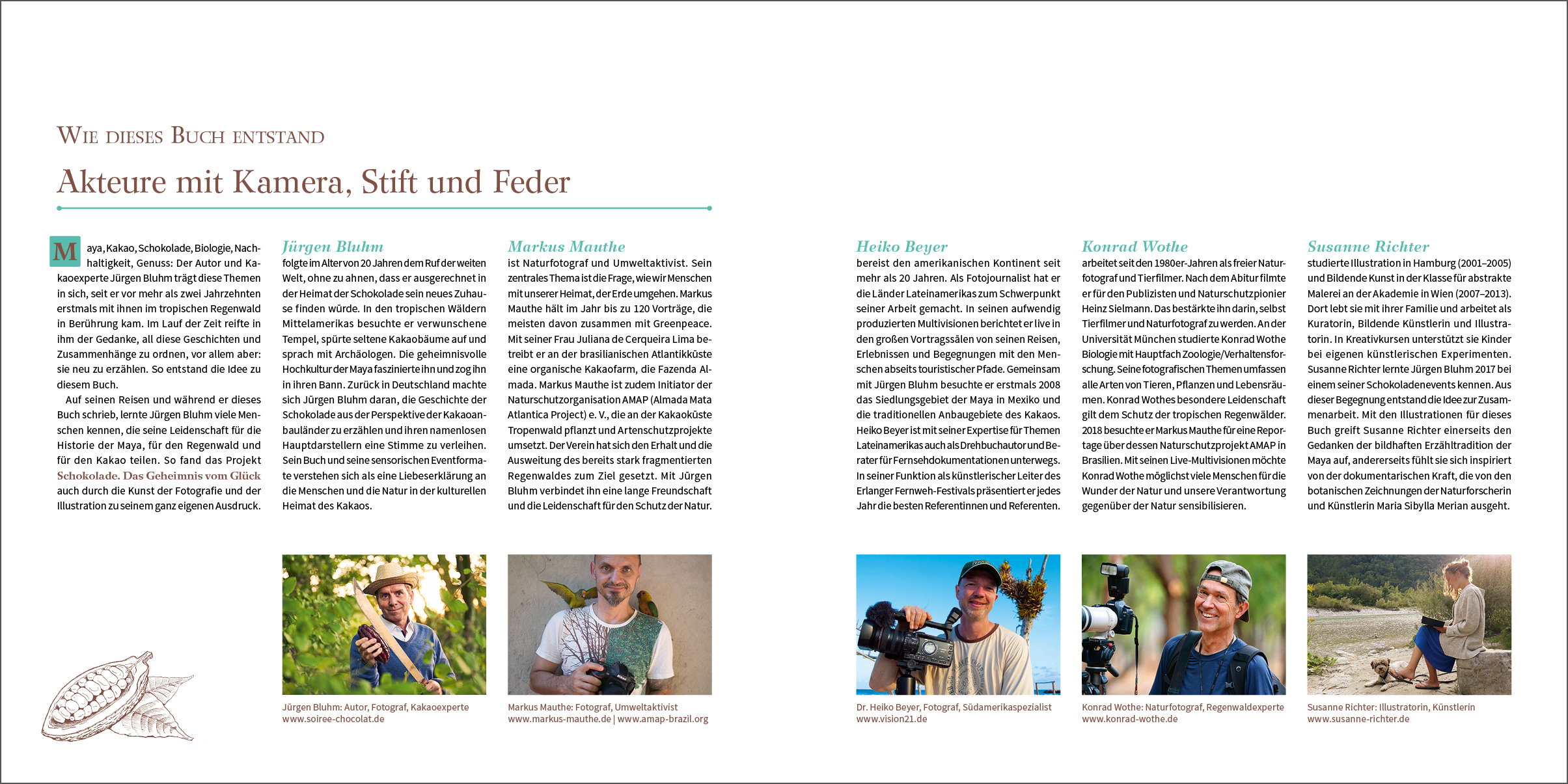 Jürgen Bluhm folgte im Alter von 20 Jahren dem Ruf der weiten Welt ohne zu ahnen, dass er ausgerechnet in der Heimat der Schokolade sein neues Zuhause finden würde. In den tropischen Wäldern Mittelamerikas besuchte er verwunschene Tempel, spürte seltene Kakaobäume auf und sprach mit Archäologen. Die geheimnisvolle Hochkultur der Maya faszinierte ihn und zog ihn in ihren Bann. Zurück in Deutschland machte sich Jürgen Bluhm daran, der Natur und den Menschen eine Stimme zu verleihen. Sein Buch und seine sensorischen Schokoladen-Events sind eine Liebeserklärung an die Kultur Lateinamerikas.