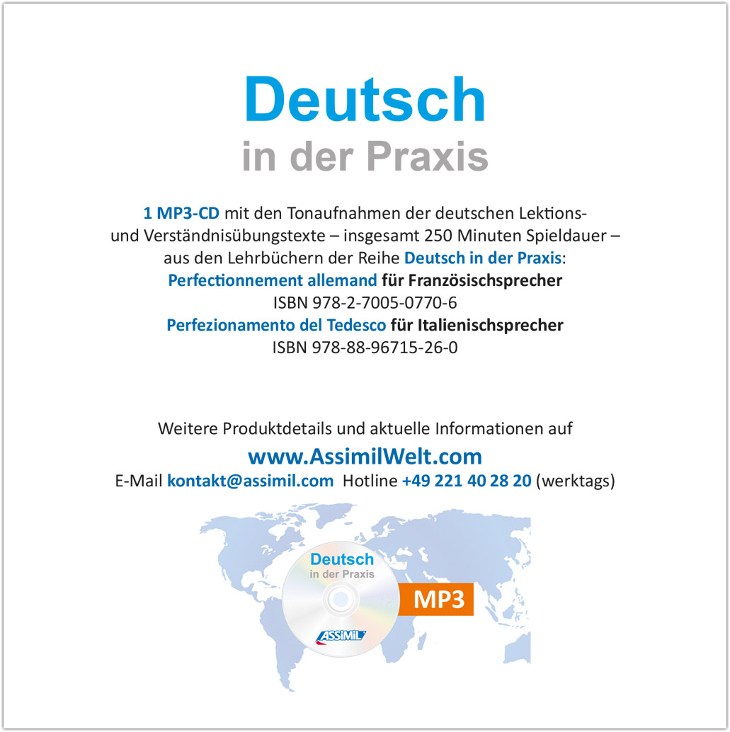 Die MP3-CD (250 Minuten Spieldauer) enthält die deutschsprachigen Tonaufnahmen (Lektionstexte und Verständnisübungen) passend zu den untenstehenden Lehrbüchern. Die Aufnahmen wurden ausschließlich mit Muttersprachlern (allesamt professionelle Sprecherinnen und Sprecher) produziert. Die MP3-CD bietet zusätzlich eine Textanzeigefunktion bei geeignetem Abspielgerät.