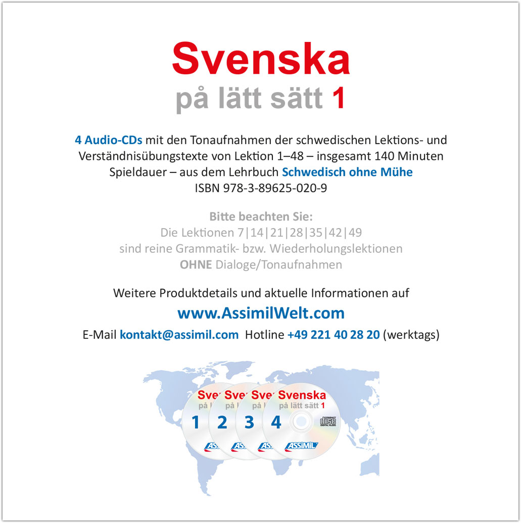 Die Audio-CDs (140 Minuten Spieldauer, Lektion 1-48) enthalten die schwedischen Tonaufnahmen (Lektionstexte und Verständnisübungen) passend zum Lehrbuch "Schwedisch ohne Mühe". Die Aufnahmen wurden ausschließlich mit Muttersprachlern (allesamt professionelle Sprecherinnen und Sprecher) produziert. Die Sprechgeschwindigkeit ist dem jeweiligen Lektionsniveau angepasst.