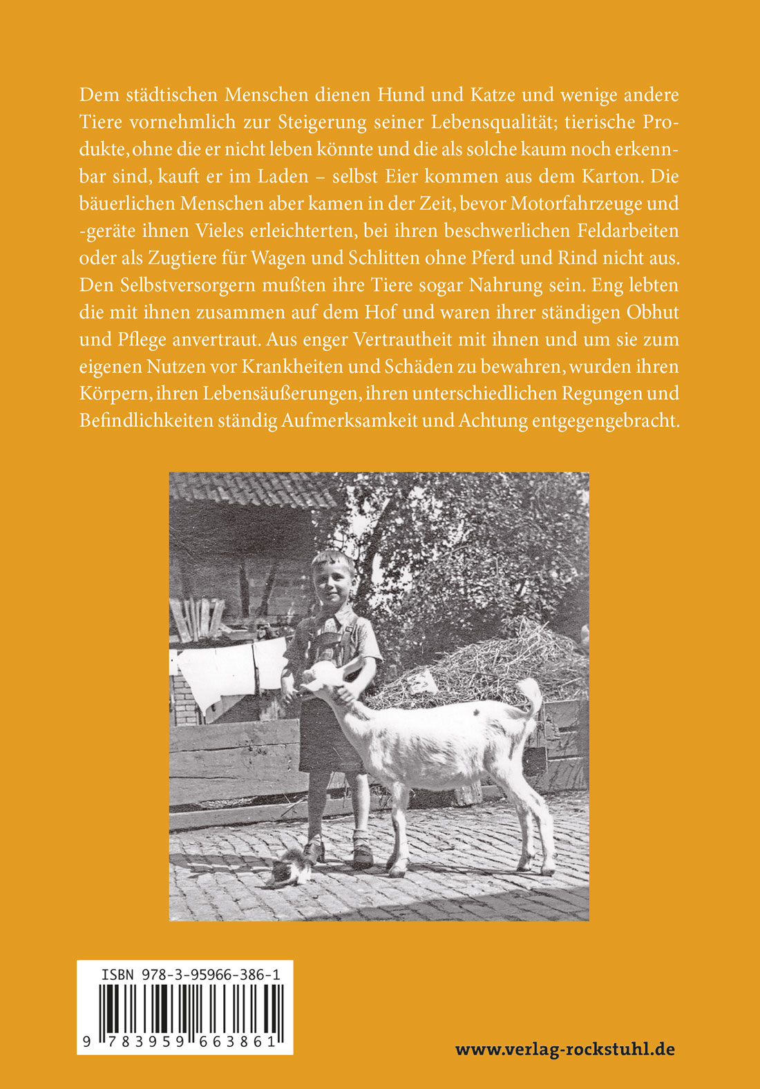 Dem städtischen Menschen dienen Hund und Katze und wenige andere Tiere vornehmlich zur Steigerung seiner Lebensqualität; tierische Produkte, ohne die er nicht leben könnte und die als solche kaum noch erkennbar sind, kauft er im Laden - selbst Eier kommen aus dem Karton. Die bäuerlichen Menschen aber kamen in der Zeit, bevor Motorfahrzeuge und -geräte ihnen Vieles erleichterten, bei ihren beschwerlichen Feldarbeiten oder als Zugtiere für Wagen und Schlitten ohne Pferd und Rind nicht aus. Den Selbstversorgern mußten ihre Tiere sogar Nahrung sein. Eng lebten die mit ihnen zusammen auf dem Hof und waren ihrer ständigen Obhut und Pflege anvertraut. Aus enger Vertrautheit mit ihnen und um sie zum eigenen Nutzen vor Krankheiten und Schäden zu bewahren, wurden ihren Körpern, ihren Lebensäußerungen, ihren unterschiedlichen Regungen und Befindlichkeiten ständig Aufmerksamkeit und Achtung entgegengebracht.