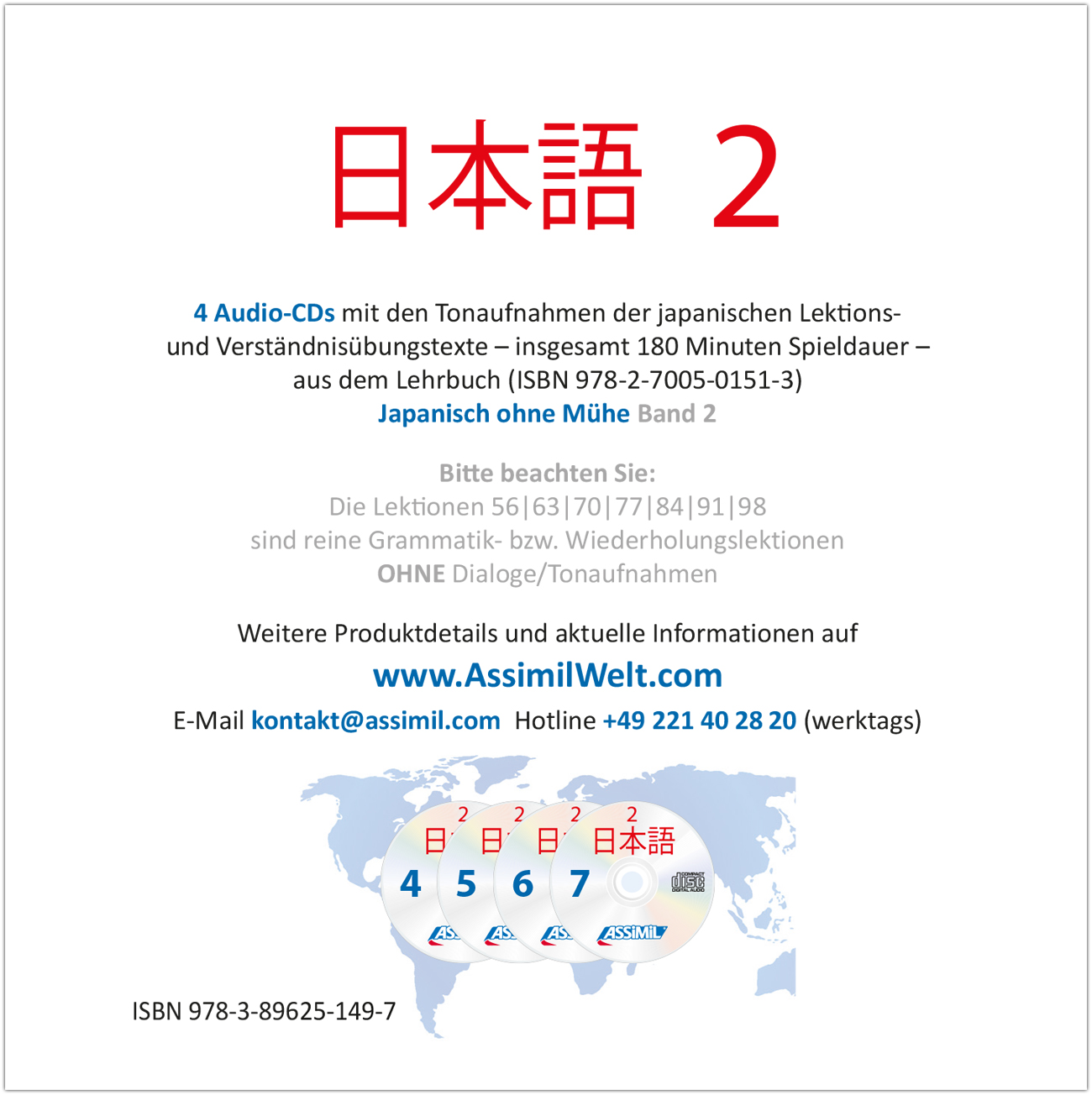 Die Audio-CDs (180 Minuten Spieldauer) enthalten die japanischen Tonaufnahmen (Lektionstexte und Verständnisübungen) passend zum Lehrbuch "Japanisch ohne Mühe Band 2". Die Aufnahmen wurden ausschließlich mit Muttersprachlern (allesamt professionelle Sprecherinnen und Sprecher) produziert. Die Sprechgeschwindigkeit ist dem jeweiligen Lektionsniveau angepasst.