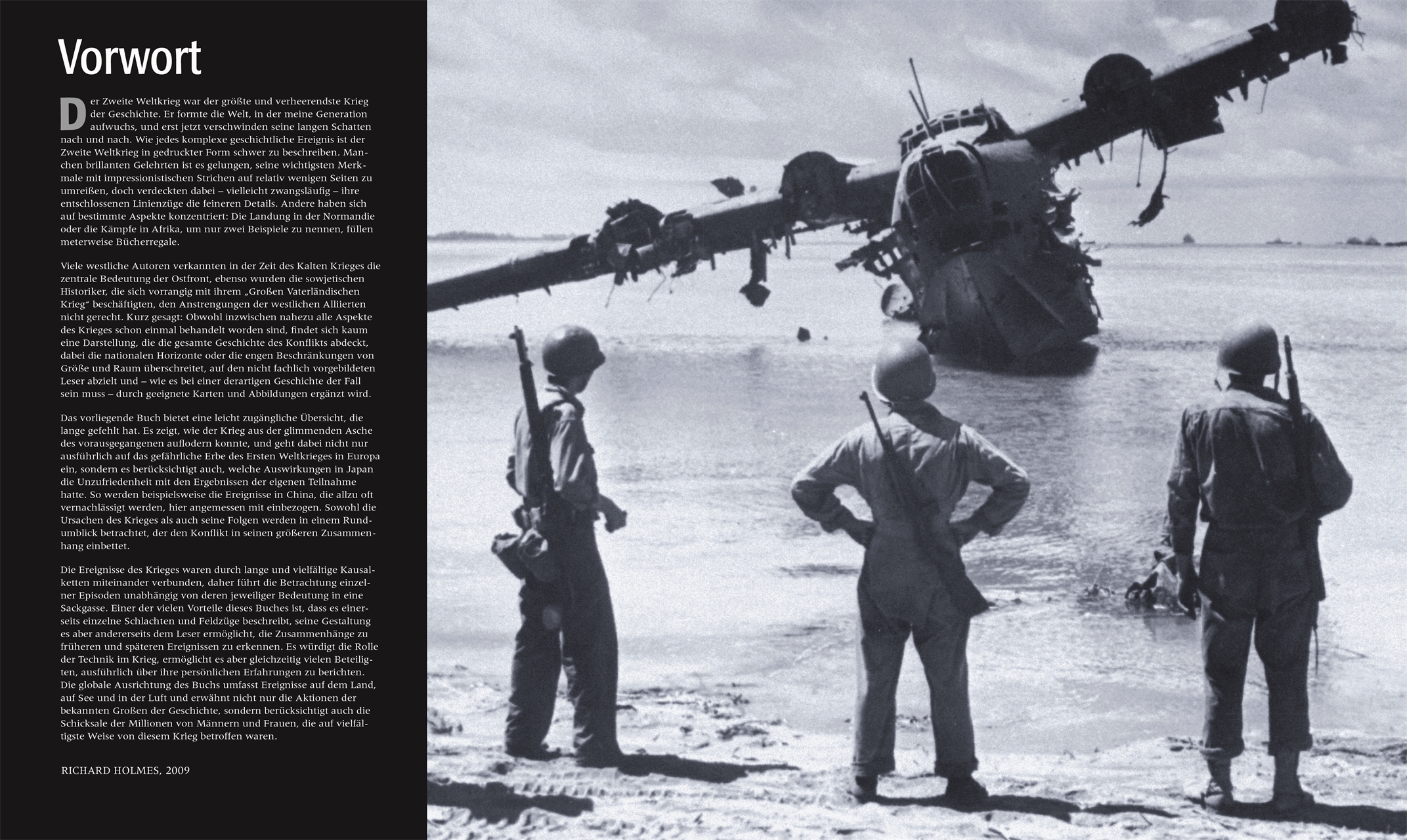 Dieses großformatige Nachschlagewerk bietet mit einer Fülle von Fotos, Karten, Zitaten und informativen Texten eine umfangreiche Dokumentation des Zweiten Weltkrieges, seiner Vorgeschichte sowie seiner unmittelbaren und langfristigen Folgen. Von Europa über Nordafrika und den Pazifik berücksichtigt es dabei alle Schauplätze und skizziert die größten militärischen Operationen zu Lande, zu See und in der Luft. Zudem werden die ideologischen Hintergründe, die Propaganda und das Leben an der Heimatfront thematisiert, ebenso wie der Holocaust und die Kriegsverbrechen in Europa und Asien.