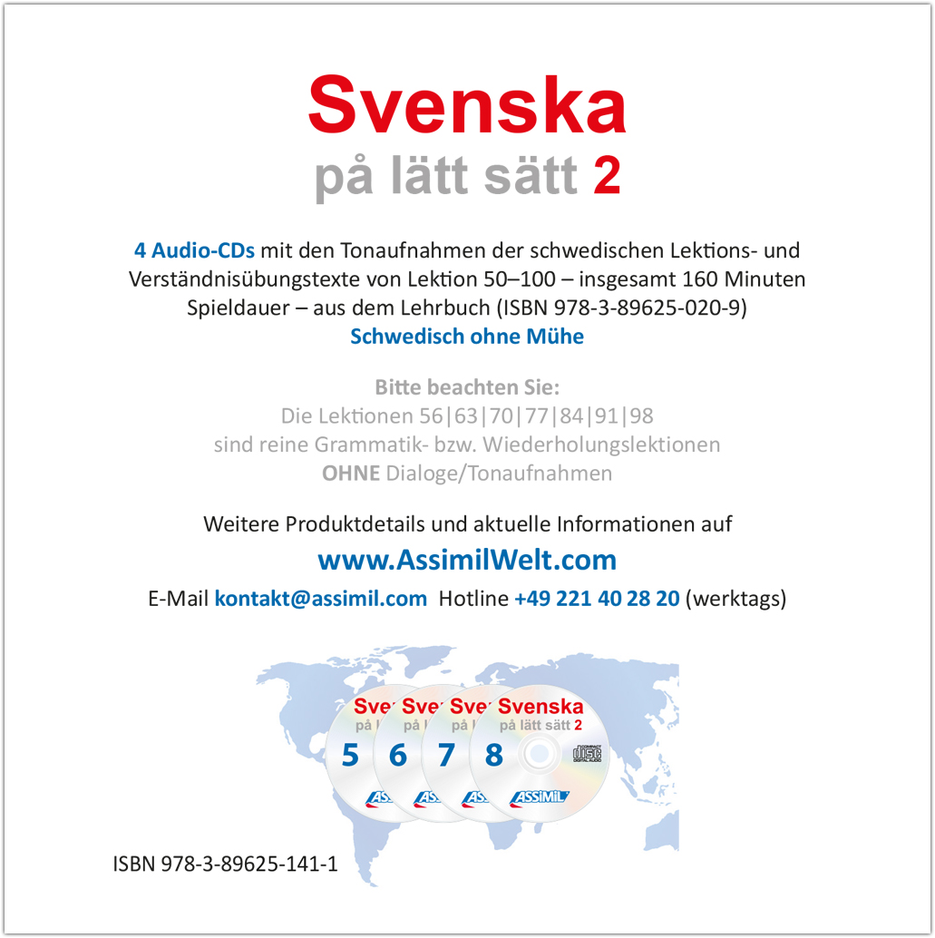 Die Audio-CDs (160 Minuten Spieldauer, Lektion 50-100) enthalten die schwedischen Tonaufnahmen (Lektionstexte und Verständnisübungen) passend zum Lehrbuch "Schwedisch ohne Mühe". Die Aufnahmen wurden ausschließlich mit Muttersprachlern (allesamt professionelle Sprecherinnen und Sprecher) produziert. Die Sprechgeschwindigkeit ist dem jeweiligen Lektionsniveau angepasst.