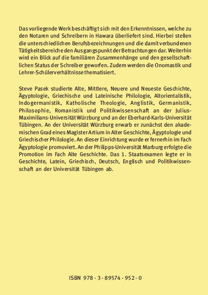 Das vorliegende Werk beschäftigt sich mit den Erkenntnissen, welche zu den Notaren und Schreibern in Hawara überliefert sind. Hierbei stellen die unterschiedlichen Berufsbezeichnungen und die damit verbundenen Tätigkeitsbereiche den Ausgangspunkt der Betrachtungen dar. Weiterhin wird ein Blick auf die familiären Zusammenhänge und den gesellschaftlichen Status der Schreiber geworfen. Zudem werden die Onomastik und Lehrer-Schülerverhältnisse thematisiert.