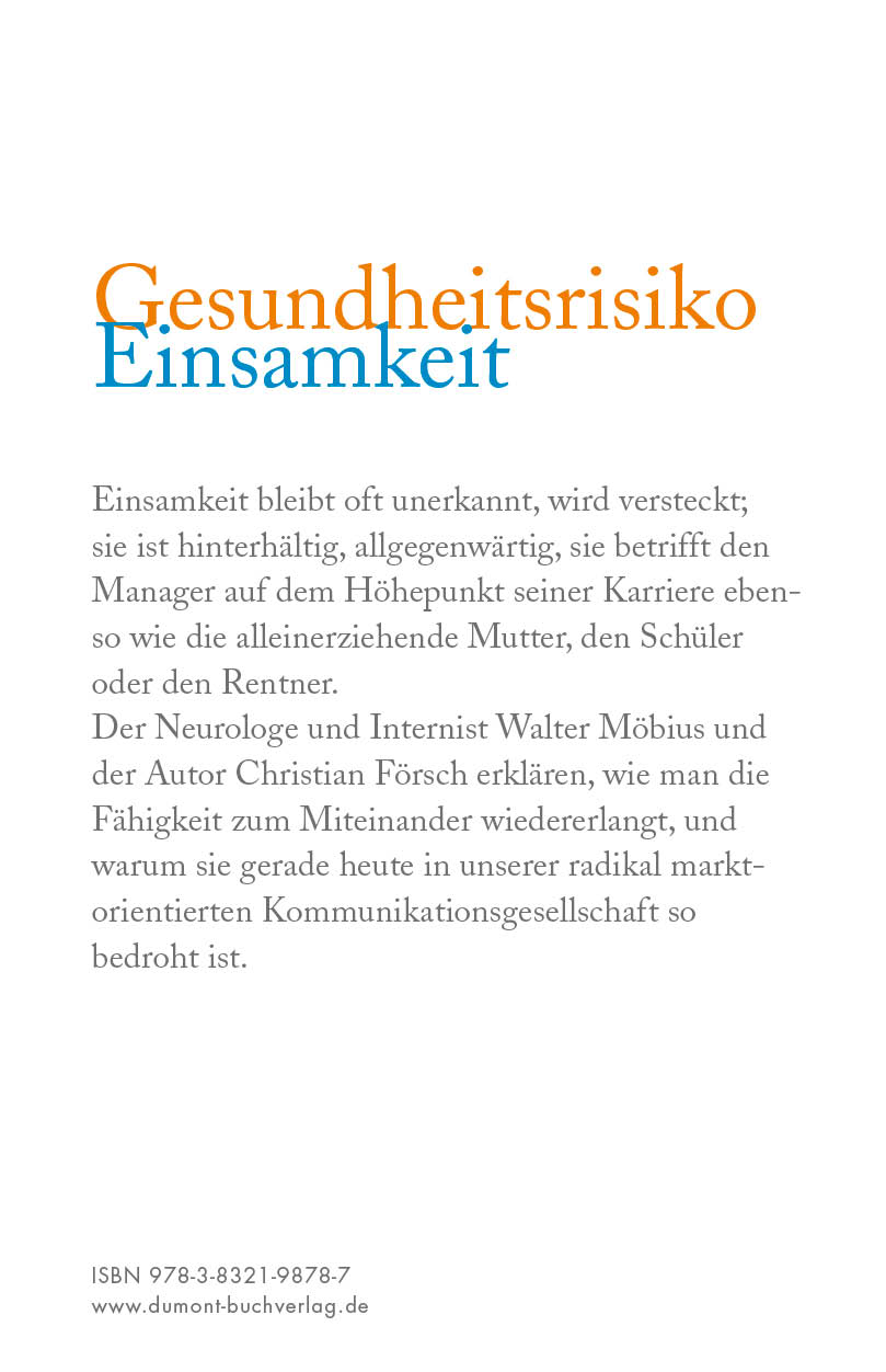 Der Neurologe und Internist Walter Möbius und der Autor Christian Försch zeigen in diesem Buch ›7 Wege aus der Einsamkeit‹ auf. Kenntnisreich und anhand vieler Fallbeispiele beschreiben die Autoren, wie man sich aus gedanklichen und emotionalen Zwängen befreit und den Prozess der Vereinsamung aufhalten und umkehren kann. Die Akzeptanz der eigenen Person und der eigenen Grenzen ist dabei ebenso wichtig wie Spielfreude, Sinnlichkeit und Neugier.