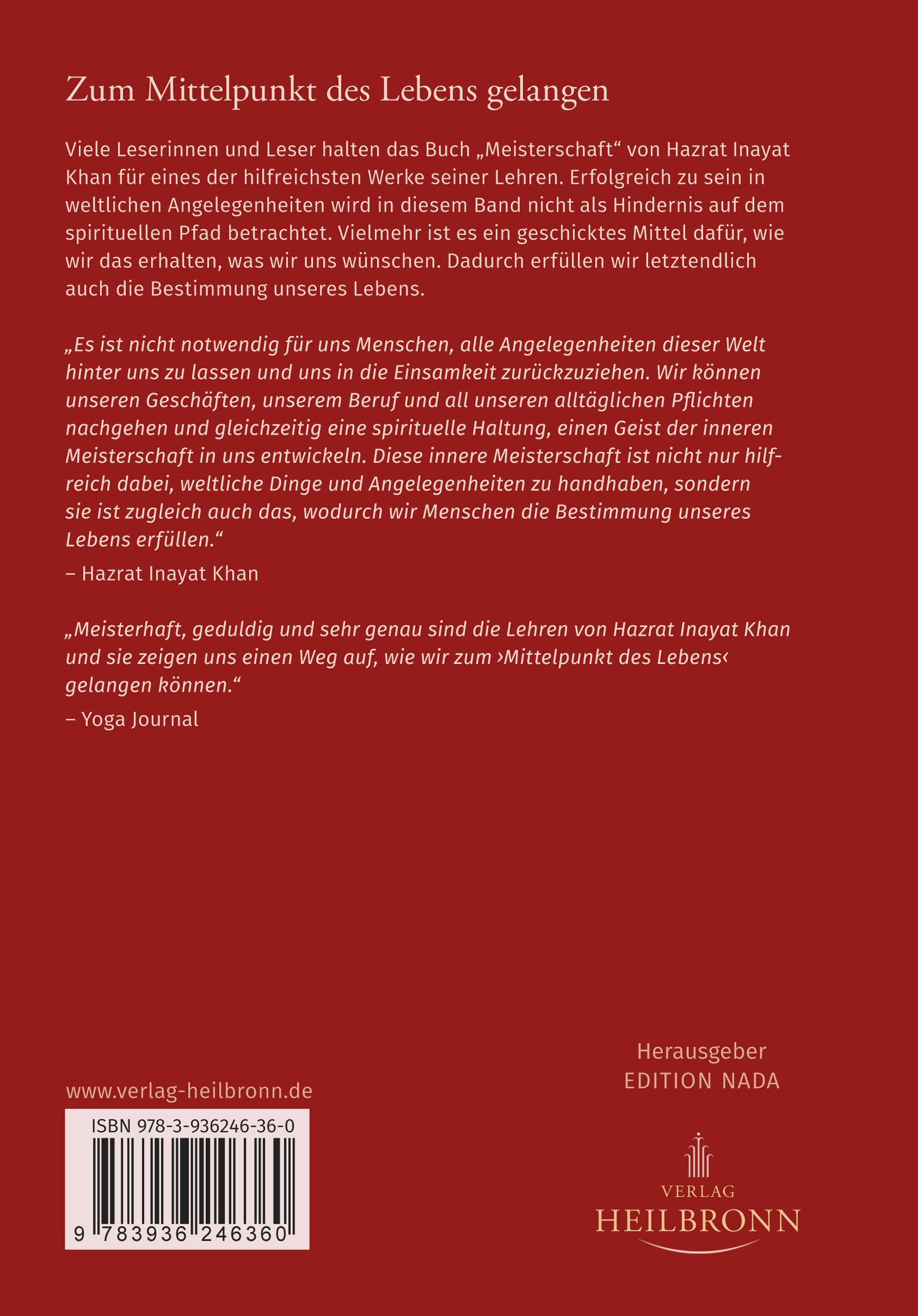 Zum Mittelpunkt des Lebens gelangen Viele Leserinnen und Leser halten das Buch "Meisterschaft" von Hazrat Inayat Khan für eines der hilfreichsten Werke seiner Lehren. Erfolgreich zu sein in weltlichen Angelegenheiten wird in diesem Band nicht als Hindernis auf dem spirituellen Pfad betrachtet. Vielmehr ist es ein geschicktes Mittel dafür, wie wir das erhalten, was wir uns wünschen. Dadurch erfüllen wir letztendlich auch die Bestimmung unseres Lebens."Es ist nicht notwendig für uns Menschen, alle Angelegenheiten dieser Welt hinter uns zu lassen und uns in die Einsamkeit zurückzuziehen. Wir können unseren Geschäften, unserem Beruf und all unseren alltäglichen Pflichten nachgehen und gleichzeitig eine spirituelle Haltung, einen Geist der inneren Meisterschaft in uns entwickeln. Diese innere Meisterschaft ist nicht nur hilfreich dabei, weltliche Dinge und Angelegenheiten zu handhaben, sondern sie ist zugleich auch das, wodurch wir Menschen die Bestimmung unseres Lebens erfüllen." HAZRAT INAYAT KHAN