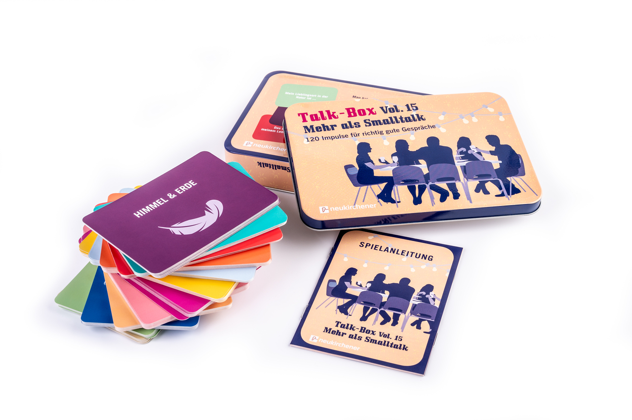 | Schlagworte | Fragen • Gastgeber • Gespräche • Gesprächseinstieg • Impulse • Kartenspiele • Smalltalk • Spiele • Talkbox |