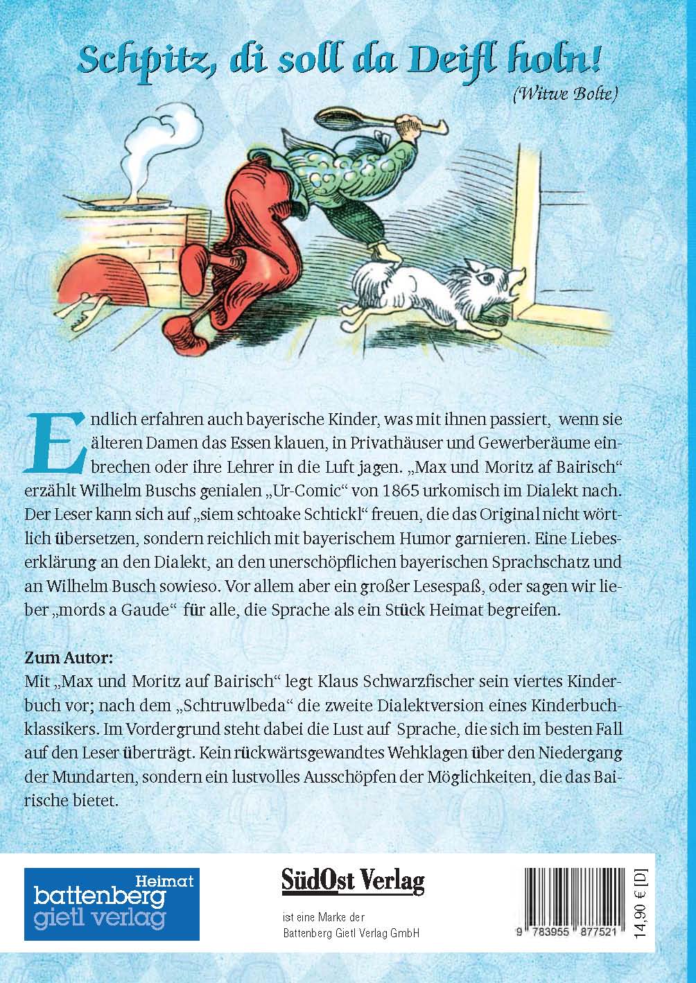 | Schlagworte | All-Age • Bairisch • bayerische Klassiker • Bayerischer Humor • Bilderbuch • Deutsche Klassiker • Geschenkbuch • Humor • Humor Dialekt • Humor Kinder • Kinder • Kinderbuch • Kinderklassiker • Klassiker Mundart • klaus schwarzfischer • Max und Moritz • Mundart • Schlawiner • schwafi • Südost-Verlag • Wilhelm Busch • Wittwe Bolte |